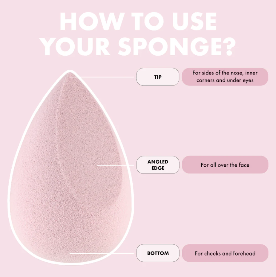 Una esponja de maquillaje angulada con tres puntos de aplicación, perfecta para cobertura localizada y para fijar con polvo.