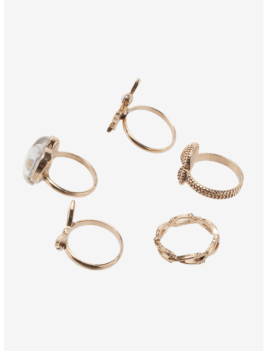 ¡Estamos canalizando todas las delicadas vibraciones del bosque con este juego de anillos! ¡Agregue un poco de clase a su look de cabaña con estos anillos dorados, que cuentan con una llamativa pieza de corazón en forma de cúpula con flores secas en el interior, un hada intrincada que sostiene una gema nacarada y más!