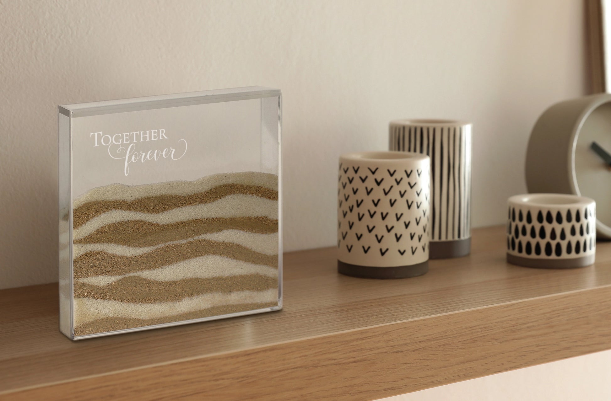El frente del marco está decorado con las palabras "Together Forever" en blanco.