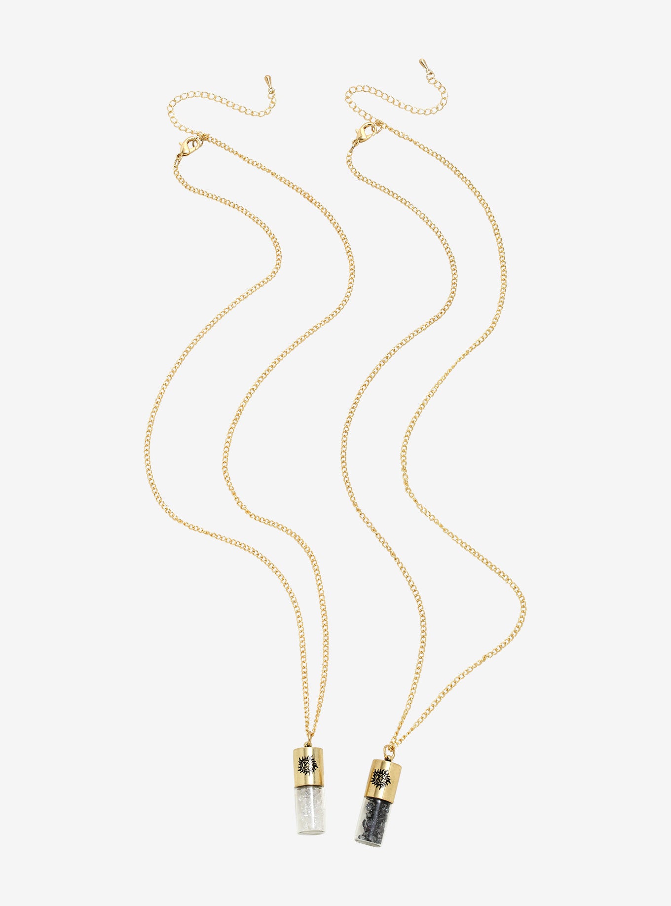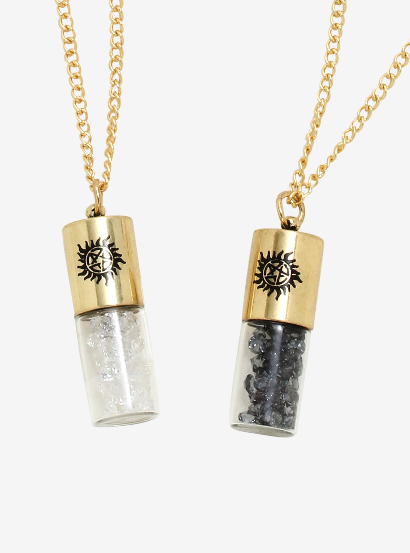 Comparte este juego de collar de Supernatural. Ah, y no lo olvides: ¡sal y quema! La tapa dorada de la botella tiene un símbolo y un diseño de texto "Bitch" o "Jerk". Cadena: 24 "de largo con extensor de 3" Botella: 1 1/4 "de alto Aleación Juego de 2