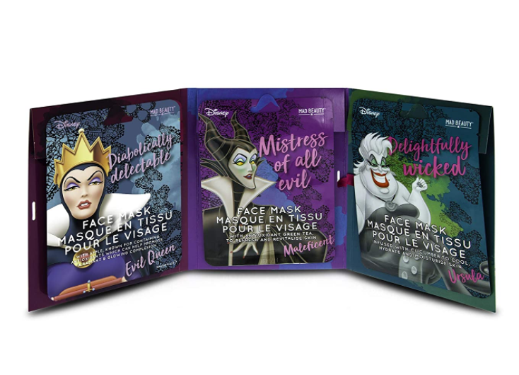 - Un libro de historia de máscaras faciales – Evil Queen: con manzana, conocido por contener antioxidantes que ayudan a promover la tez radiante y brillante. | Maléfica: con té verde antioxidante para refrescar y rejuvenecer la piel. | Ursula: impregnado con pepino para enfriar, hidratar e hidratar.