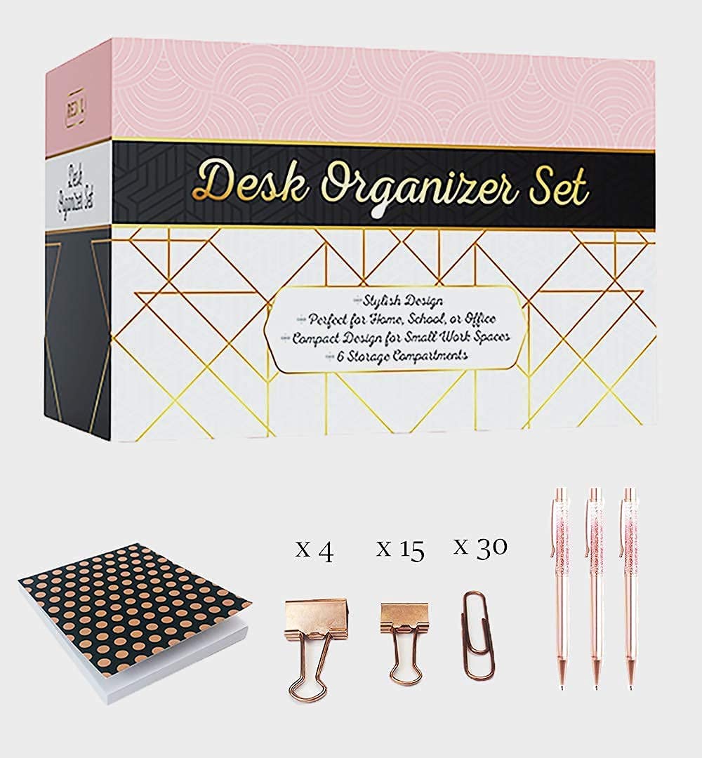 - Compacto e impresionante: este juego organizador es un gran regalo porque obtienes la ventaja adicional de una caja personalizada con 3 bolígrafos de oro rosa rellenos de purpurina rosa (recambios incluidos).