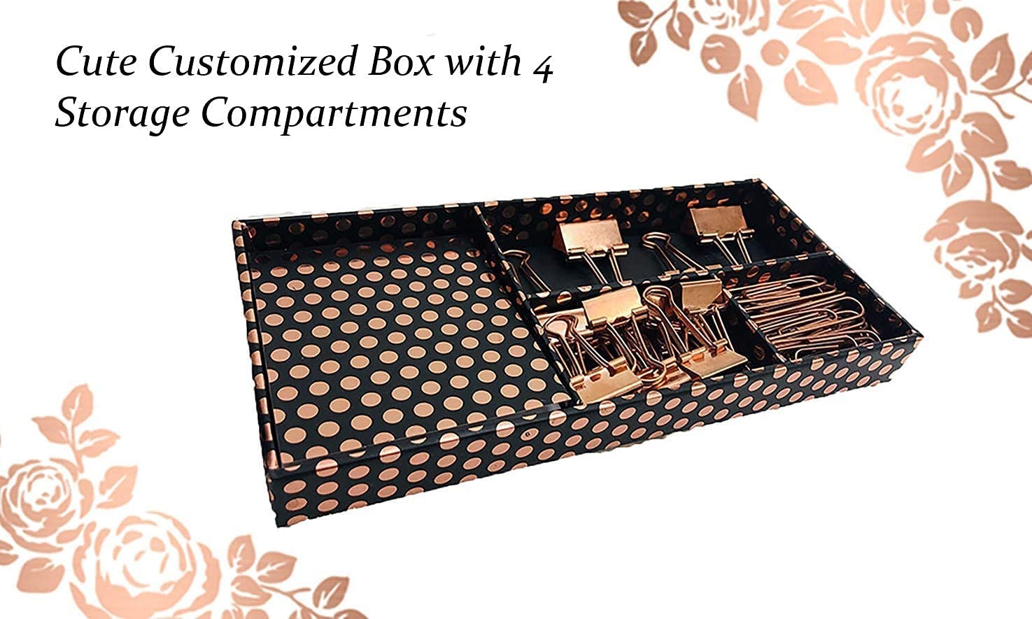 - Juego de accesorios personalizados: no te pierdas el valor de esta exclusiva caja organizadora de oro rosa y negro con bloc de notas de patrón personalizado, bolígrafos con purpurina, clips de papel de oro rosa y clips de carpeta para mantenerte organizado con estilo