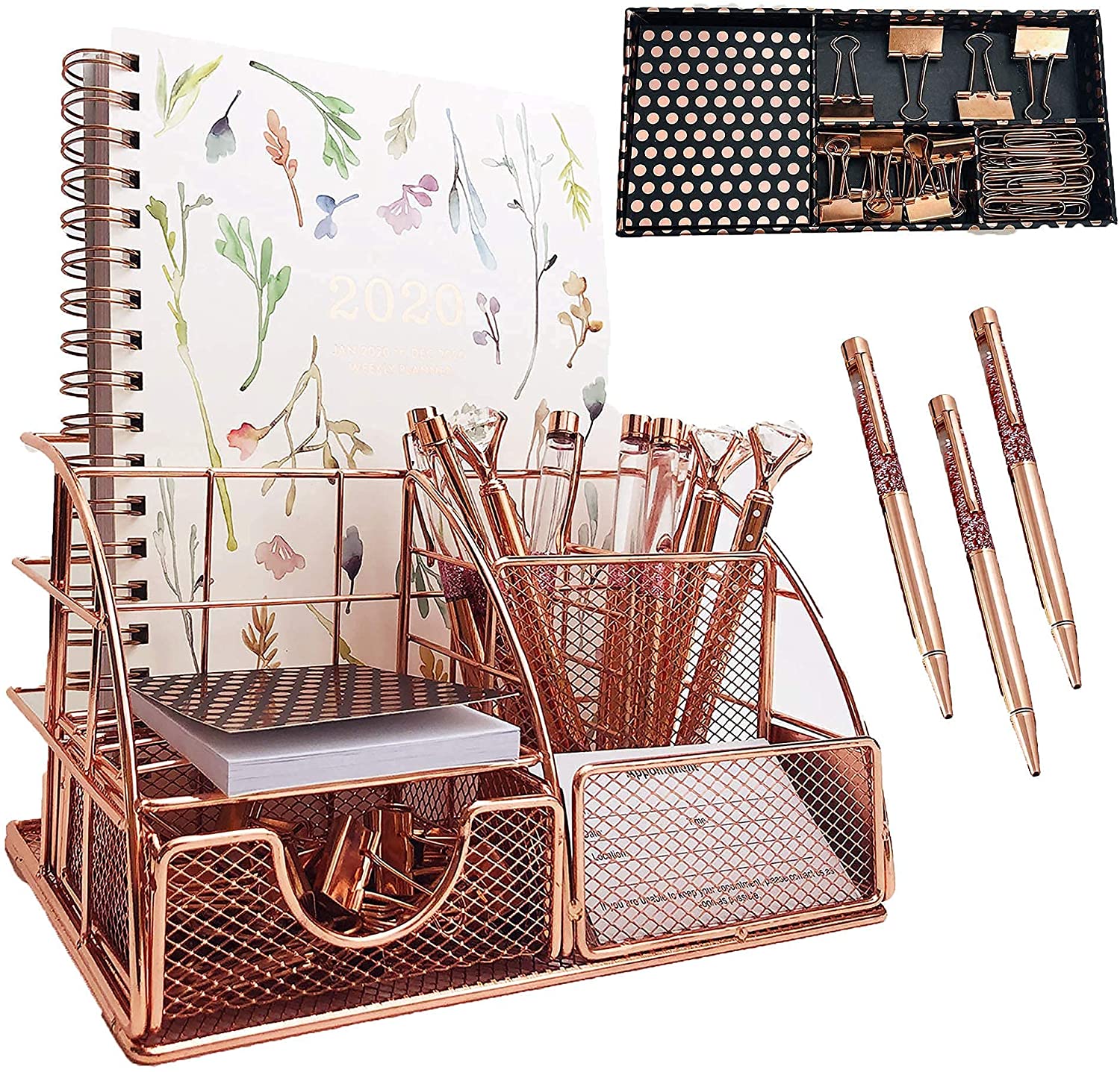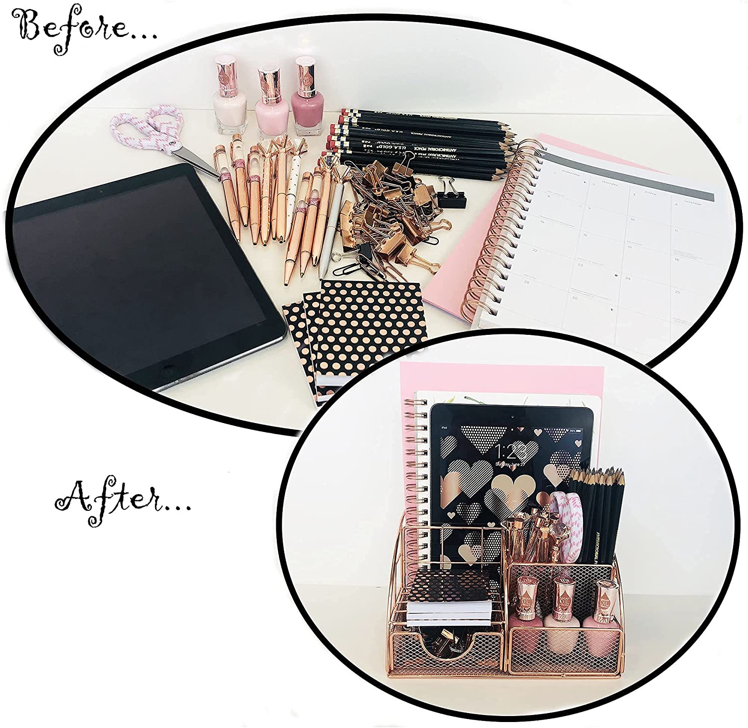 - Organízate con estilo: este organizador de escritorio de oro rosa con bolígrafos con purpurina y juego de papelería personalizado hará que tu escritorio brille con su aspecto pulido personalizado y diseño elegante. Bonito y compacto con un montón de compartimentos de almacenamiento para todas tus necesidades diarias de oficina