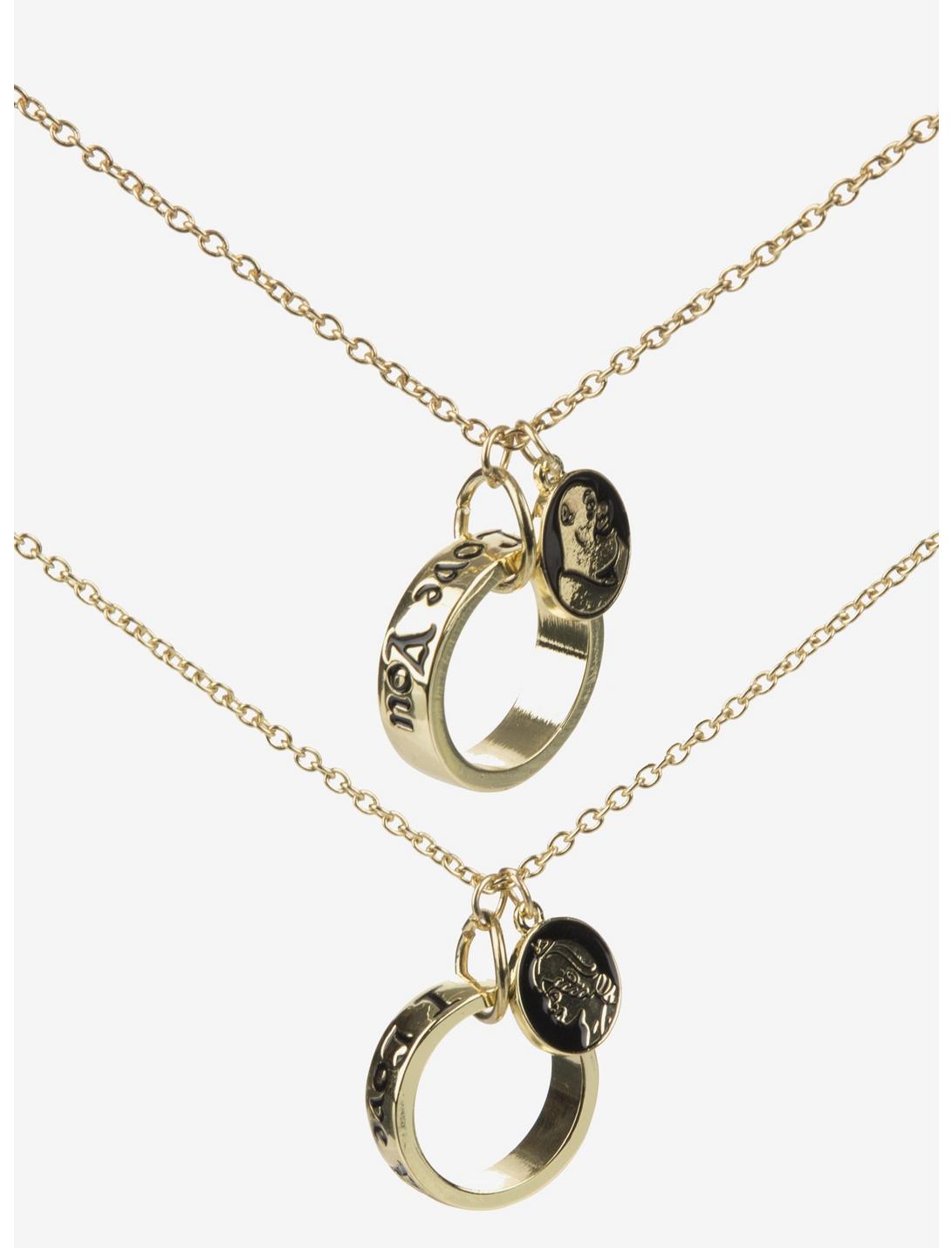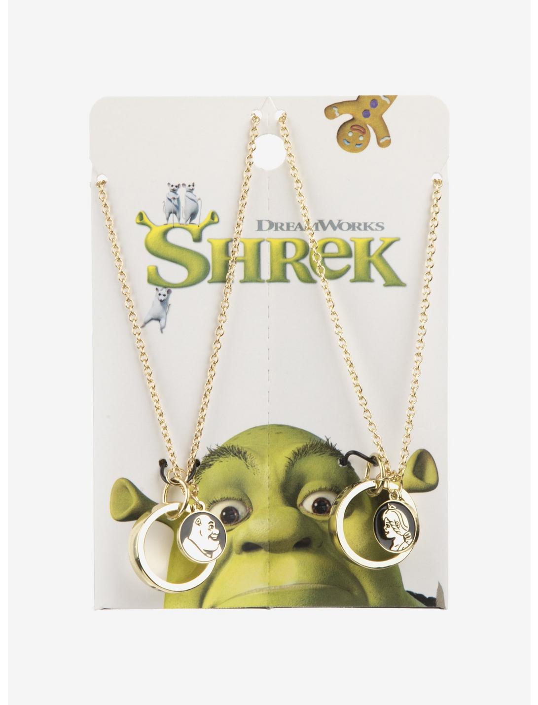 Si tu mejor amigo es la razón por la que no te sientes solo, hazle saber lo mucho que significa para ti con este conjunto de collares a juego. De Shrek, este conjunto dorado incluye anillos con "Te amo" grabado, además de amuletos de Shrek y la princesa Fiona.