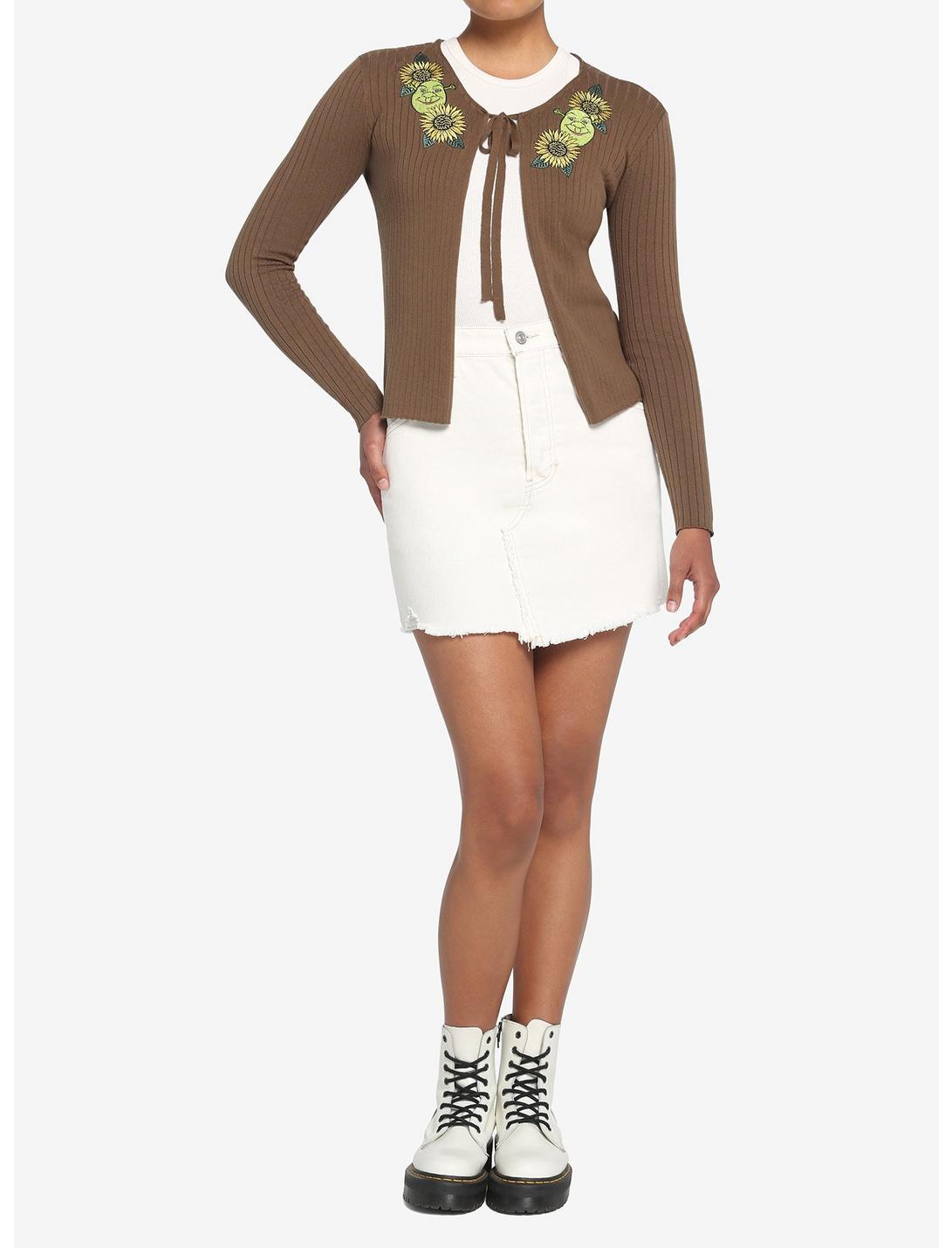 Al igual que los ogros y las cebollas tienen capas, ¡también necesitamos algunas! Manténgase abrigado con este cárdigan largo mientras visita Duloc. Representa a tu ogro favorito con este cárdigan de punto de Shrek, con parches bordados de Shrek y girasoles a lo largo del cuello superior y las correas centrales.