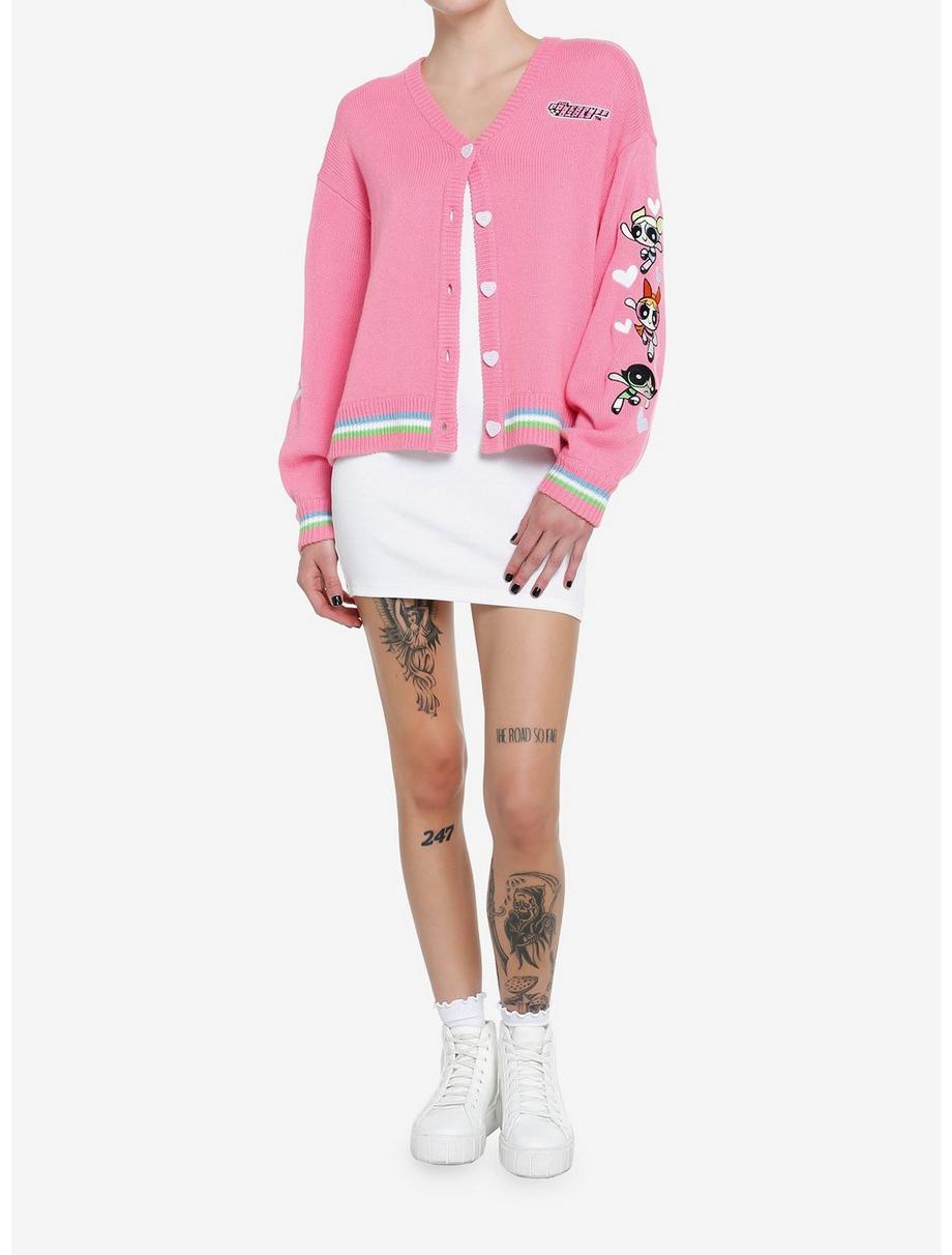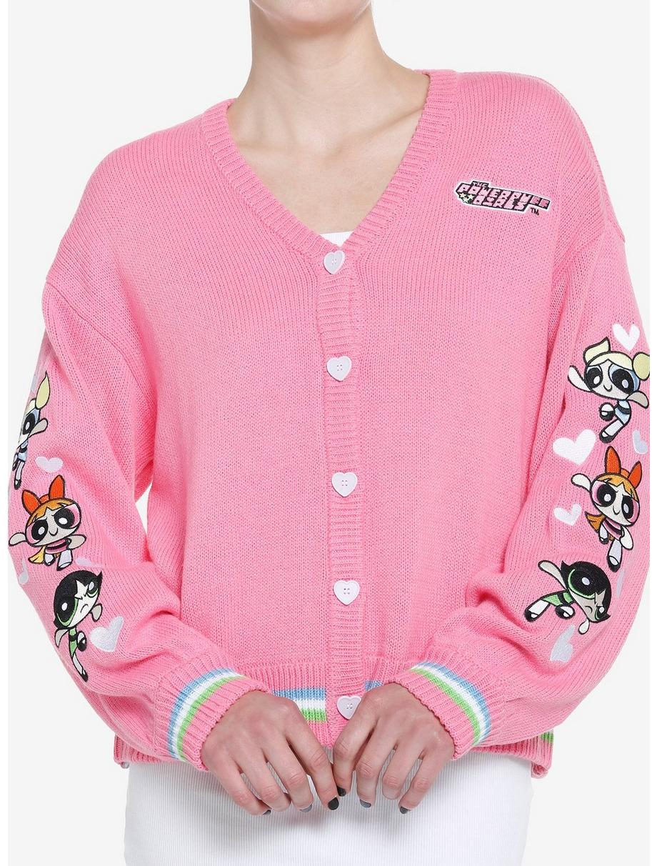Salva el mundo con estilo con este cárdigan rosa de The Powerpuff Girls con Blossom, Buttercup y Bubbles bordados en las mangas con corazones, logotipo en el lado izquierdo del pecho, ribete de rayas azules, blancas y verdes y botones en forma de corazón. 100% acrílico Lavar en frío; piso seco Importado Listado en tallas junior