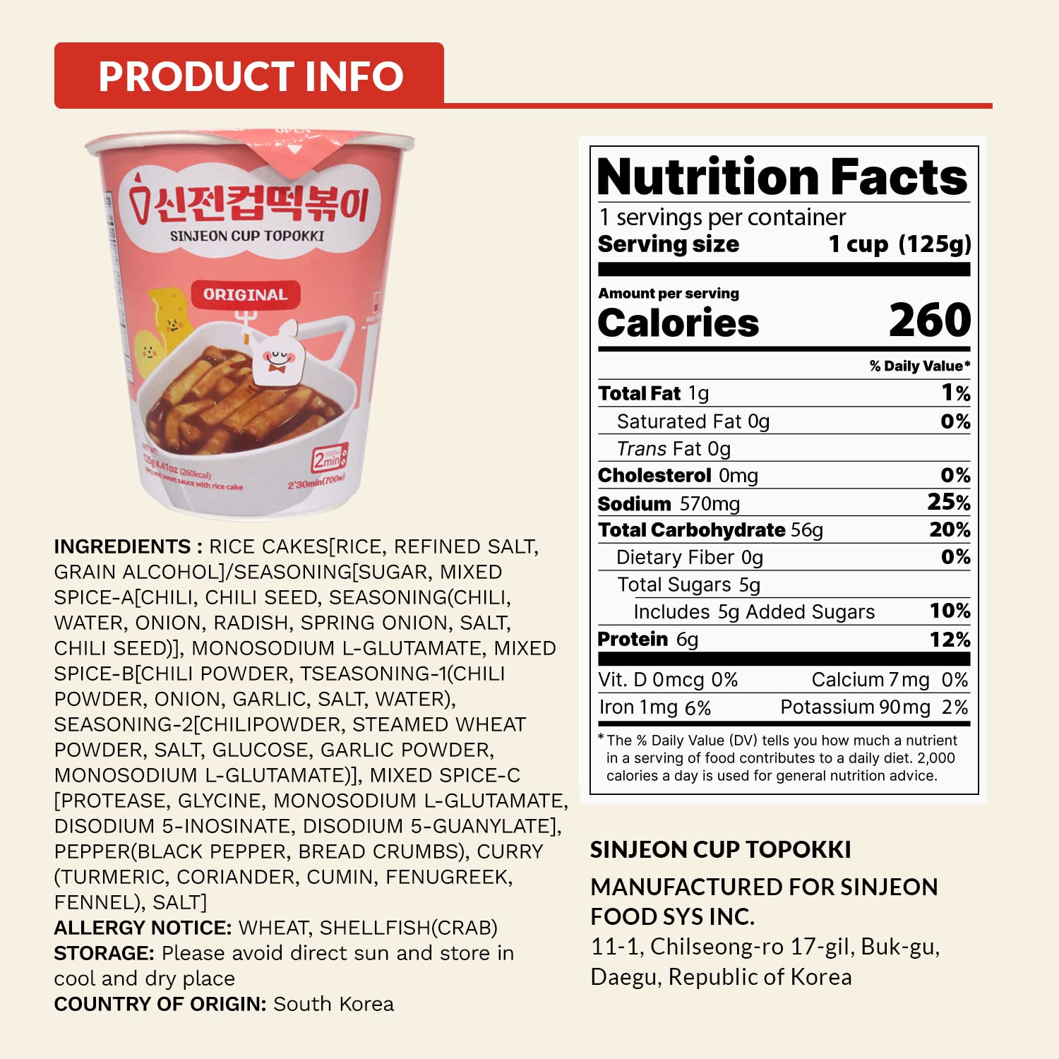 ACERCA DE SINJEON: SINJEON es una empresa de marca de franquicia Topokki que opera más de 700 tiendas de franquicia en Corea. Esta vez producimos un producto bajo nuestra marca SINJEON Cup Topokki. Nuestros productos se fabrican en Corea y el sabor ya está probado en Corea.