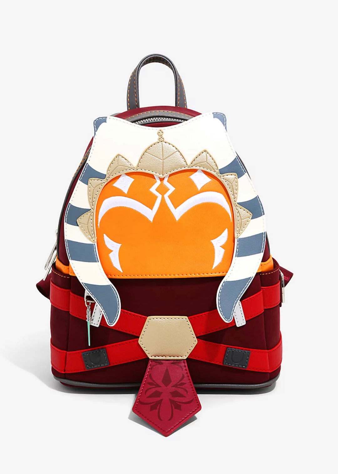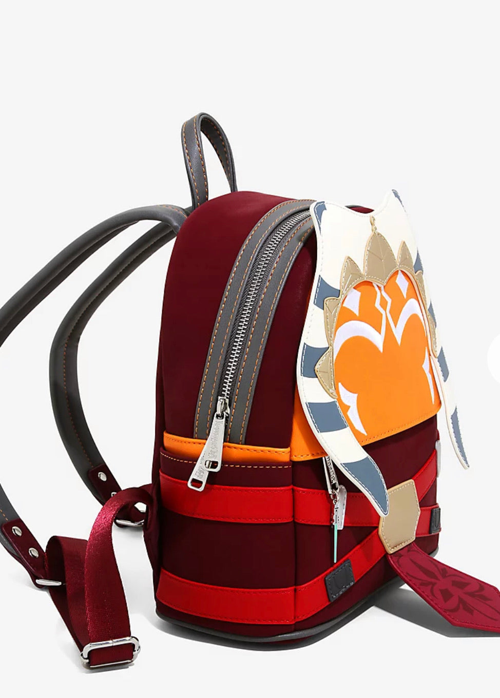 no seas un clon. ¡Destaca como Ahsoka Tano con esta mini mochila con figura de Loungefly! Las características más distinguibles del héroe Togruta se muestran en este diseño de piel sintética con detalles bordados, metálicos y aplicados. También cuenta con forro interior con un patrón "Clone Wars" y "Jedi Knight", un bolsillo interior con cremallera, herrajes en tono plateado y correas ajustables. El compartimento principal con cremallera, el bolsillo frontal con cremallera (¡con un dije verde para tirar de la cremallera con un sable láser!) Y los bolsillos laterales llevarán todos sus elementos esenciales, ¡dejando sus manos libres para agarrar sus sables láser!