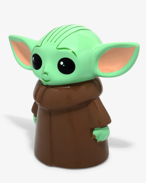 ¿Ahorrando para comprar bocadillos de ranas Sorgan? Mantenga sus monedas a salvo en este banco de monedas de The Mandalorian. Con forma de chibi Child con una ranura para monedas en la parte trasera y un tapón en la base.