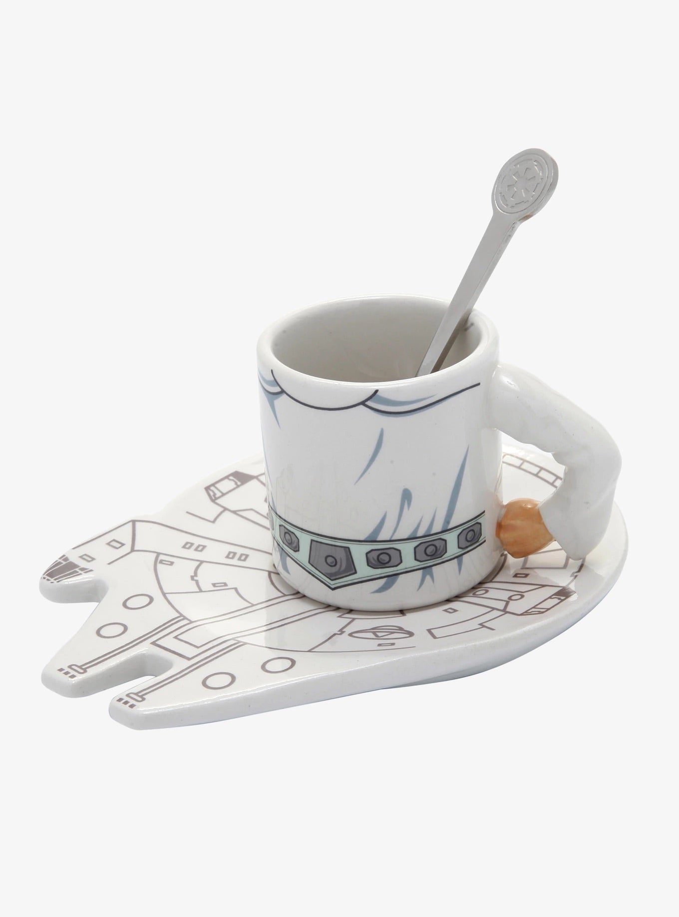 Los platos tienen la forma del Halcón Milenario y las cucharas de metal tienen el símbolo del Imperio Galáctico. Incluye: 4 cucharas, 4 platos y 4 tazas de espresso.