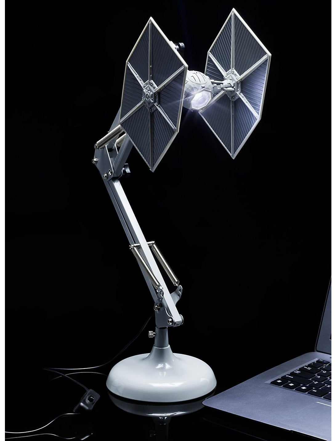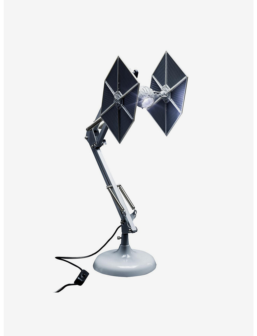 ¡Ilumina el espacio de tu escritorio con este estilo inspirado en una galaxia muy, muy lejana! Esta lámpara de escritorio de Star Wars presenta un TIE Fighter esculpido como cabeza, completamente posable para una iluminación adecuada o para mostrar el ángulo de ataque adecuado en cualquier barco de escoria Rebelde cercano.