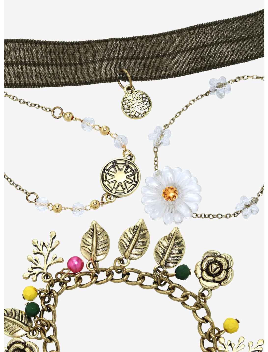 ¡Canaliza un poco de la última moda de Naboo con este juego de brazaletes de Star Wars! Inspirado en el mundo natal de Padmé Amidala, este conjunto de 4 piezas incluye dos brazaletes de cadena con amuletos del logotipo de la República Galáctica y el otro con flores, un brazalete de múltiples amuletos con piezas florales a juego con la exuberante vegetación de Naboo y un brazalete de tela con un amuleto colgante. .
