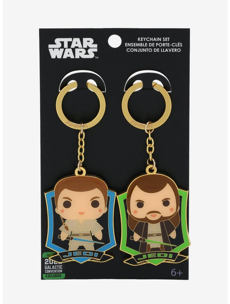 ¡Obi-Wan y Qui-Gon están aquí para llevar a cabo sus misiones Jedi en tu colección de Star Wars! Basado en sus apariciones en el Episodio I: La amenaza fantasma, este juego de llaveros Loungefly presenta diseños chibi del Jedi Padawan y el Maestro Jedi, empuñando sus sables de luz sobre los estandartes "Jedi" para darle un toque de la Era de la República a su bolso o llavero.