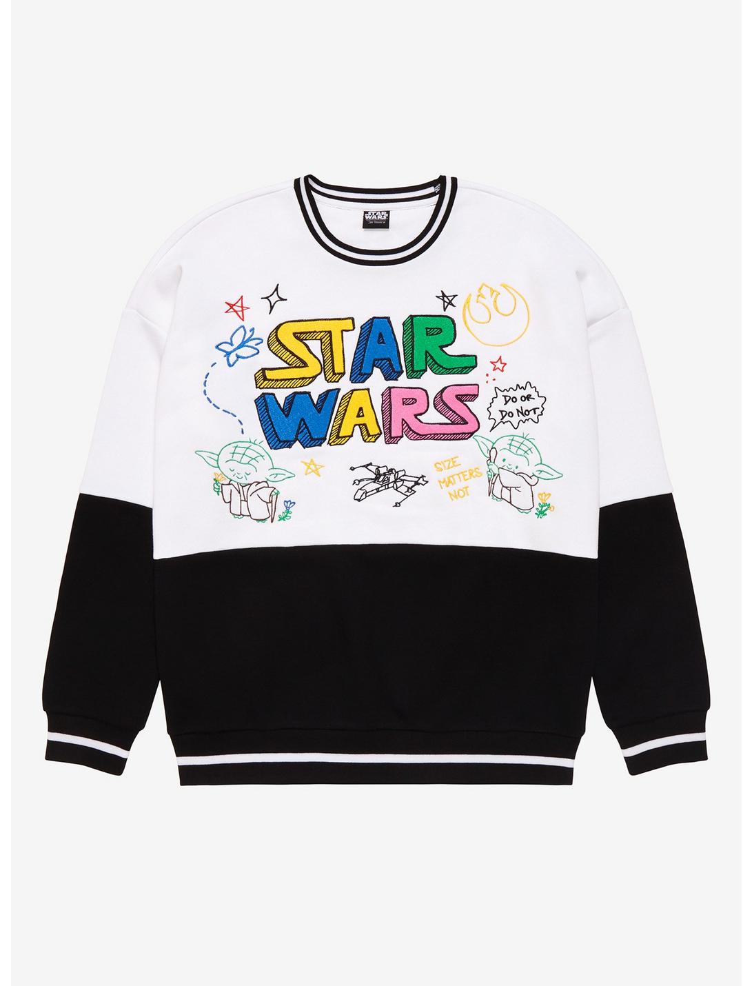 ¡Luce un estilo intergaláctico con este cómodo cuello redondo de Star Wars! Inspirado en la saga épica, este equipo presenta el logotipo de "Star Wars" totalmente bordado entre retratos estilo garabato del famoso Maestro Jedi, Yoda, y varios íconos de la serie de ciencia ficción a lo largo del panel blanco. Con una base negra en las mangas y el cuerpo, estamos seguros de que este es el estilo que estabas buscando.