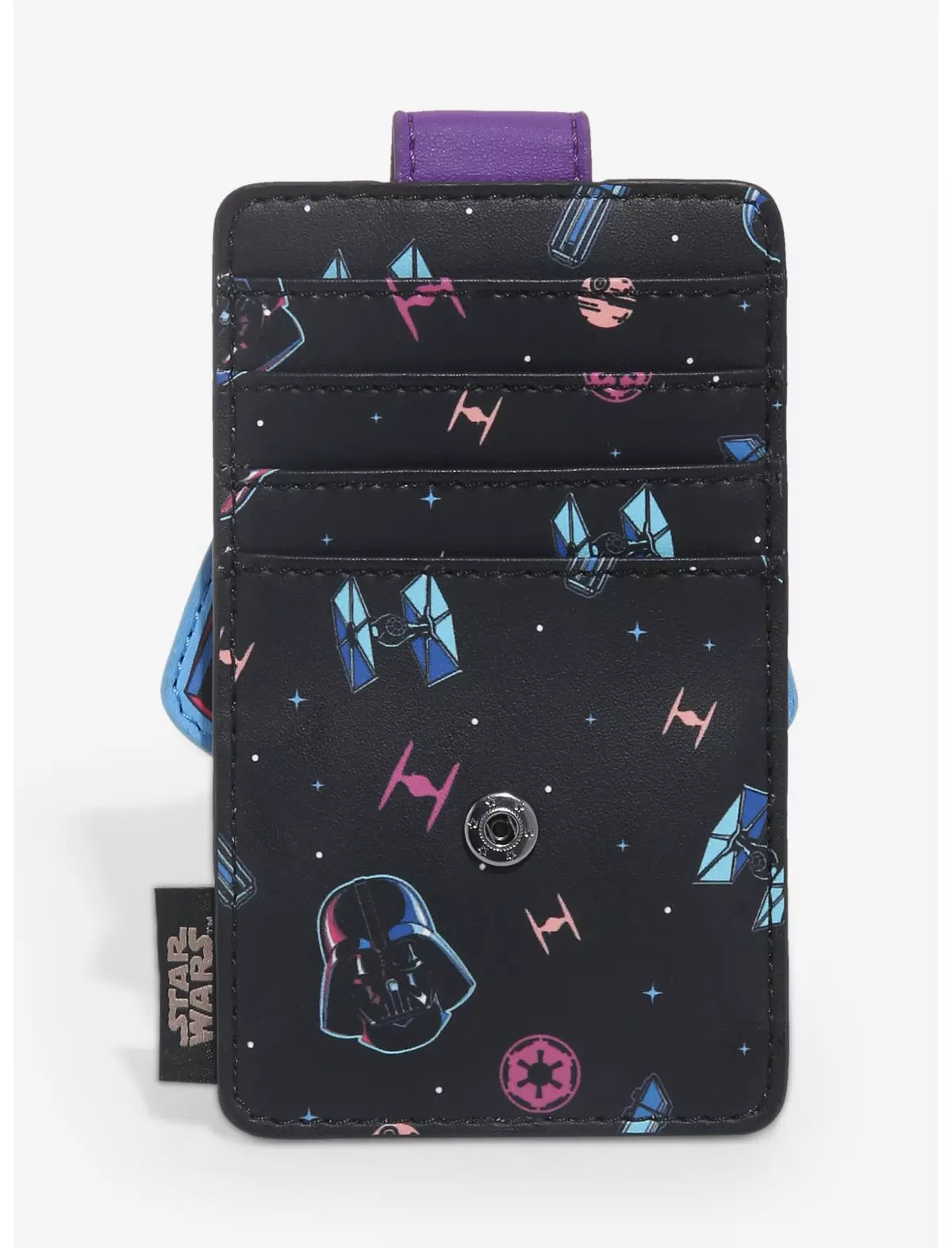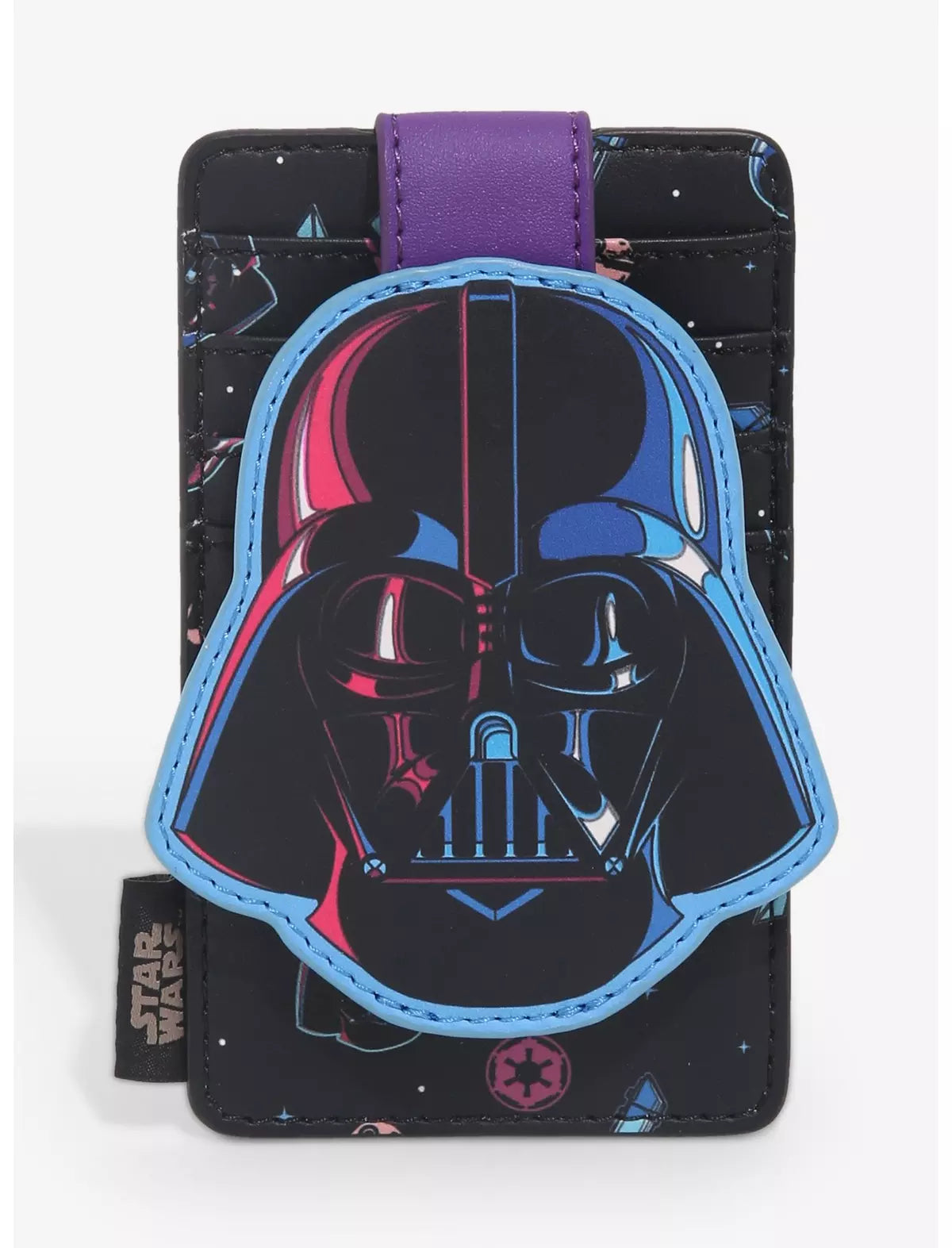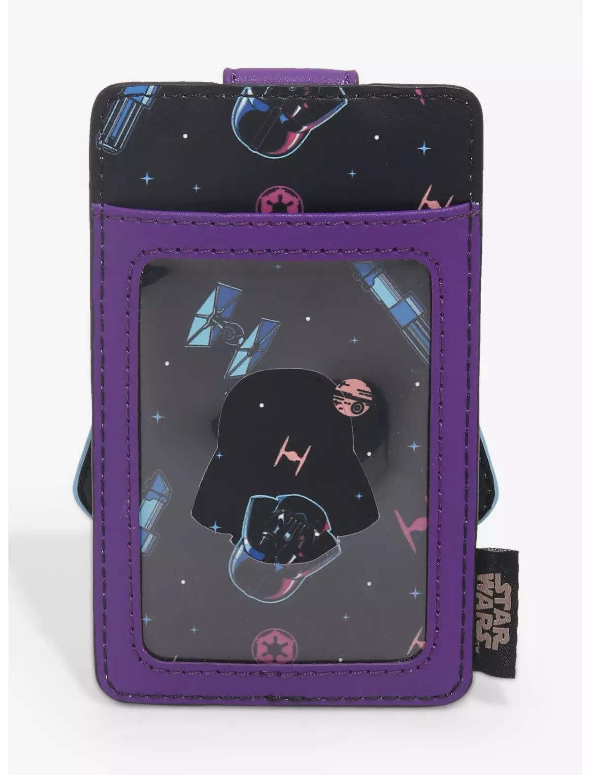 ¡Demuestra tu lealtad al Lado Oscuro con esta billetera de Star Wars! El atrevido aplique de Darth Vader luce un casco que brilla en la oscuridad, respaldado por un fondo repleto de estrellas en ambos lados. Con cuatro ranuras para tarjetas y una funda transparente para identificación (con la forma de Vader, nada menos), este tarjetero añade encanto galáctico a cualquier conjunto.