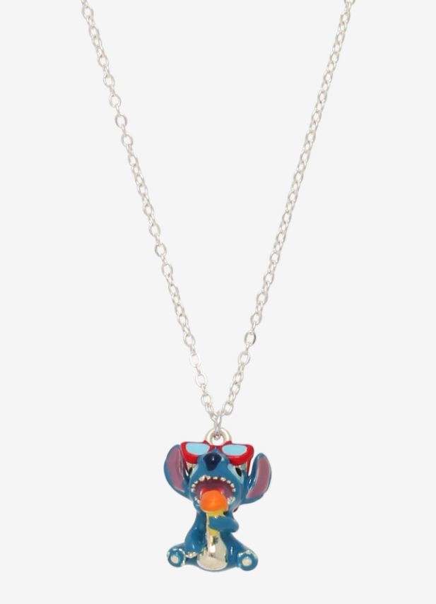 ¡Di aloha a un dulce regalo! Este collar plateado de Lilo & Stitch presenta a Stitch disfrutando de un cono de helado.