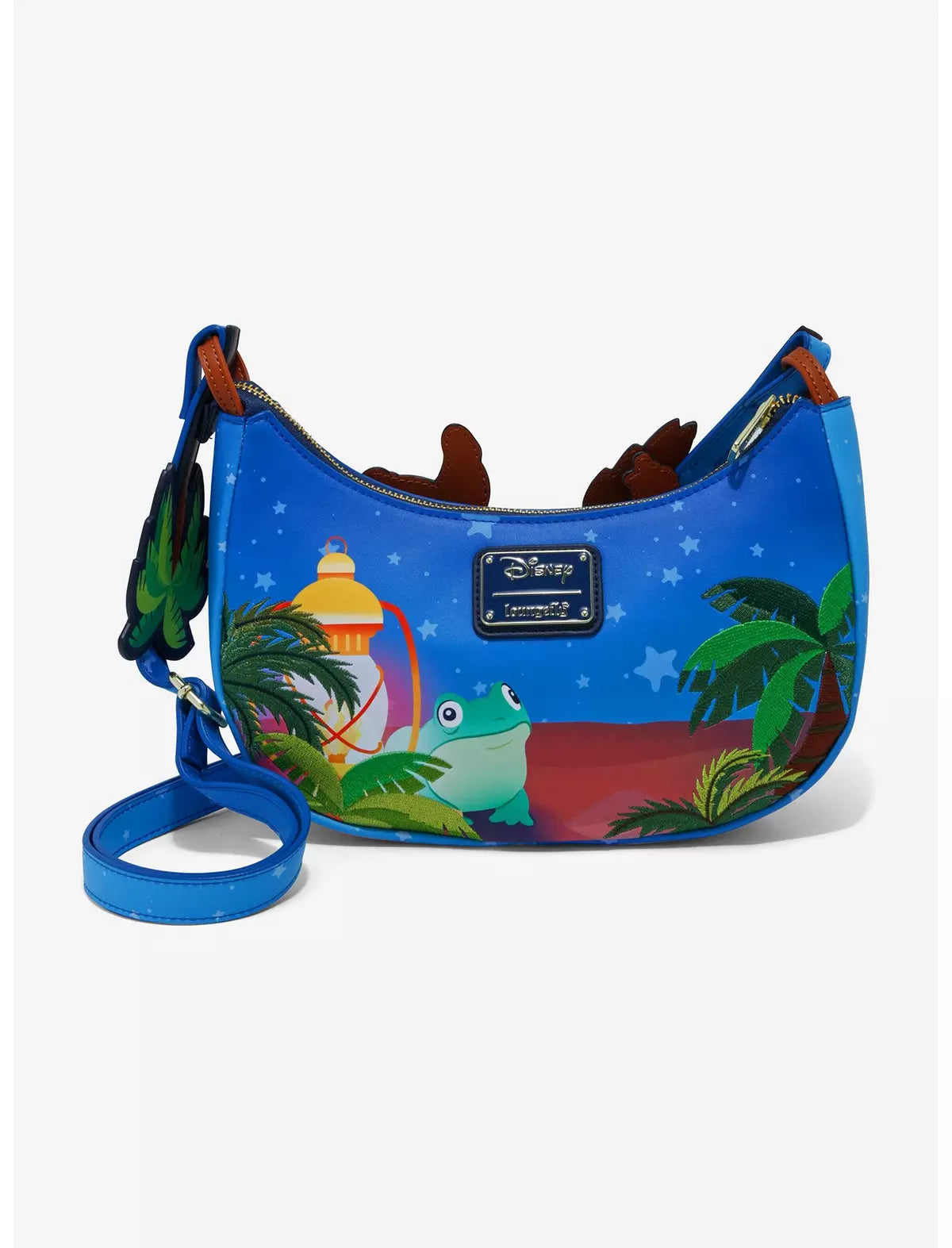 ¡Di aloha a este bolso de Lilo & Stitch! Este bolso cruzado presenta un aplique de hamaca oscilante atado con hilo marrón, con Stitch, Scrump y sus amigos patitos descansando en el interior. Un cuerpo estrellado presenta hojas bordadas, mientras que apliques de palmeras suben por las correas laterales, agregando un toque tropical a cualquier salida.