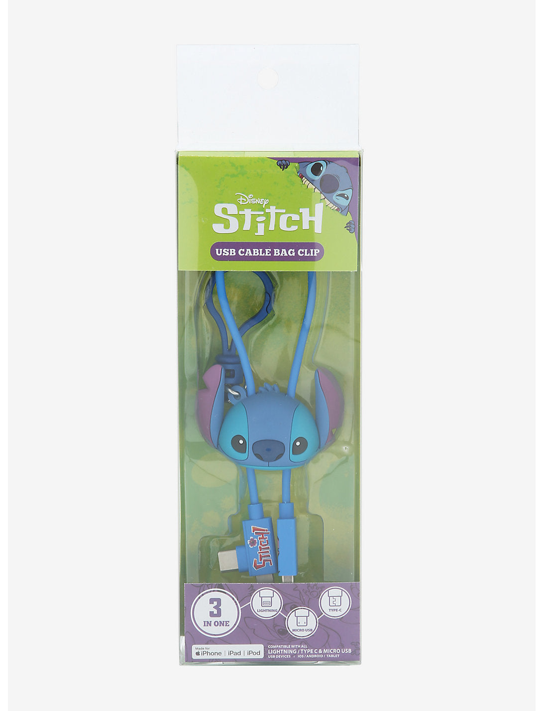 Stitch puede ser un agente del caos, pero sabe que es responsable con sus dispositivos electrónicos. Este clip para cable USB cuenta con un cabezal Stitch en forma de figura y un conector 3 en 1 (relámpago, micro USB y tipo C).