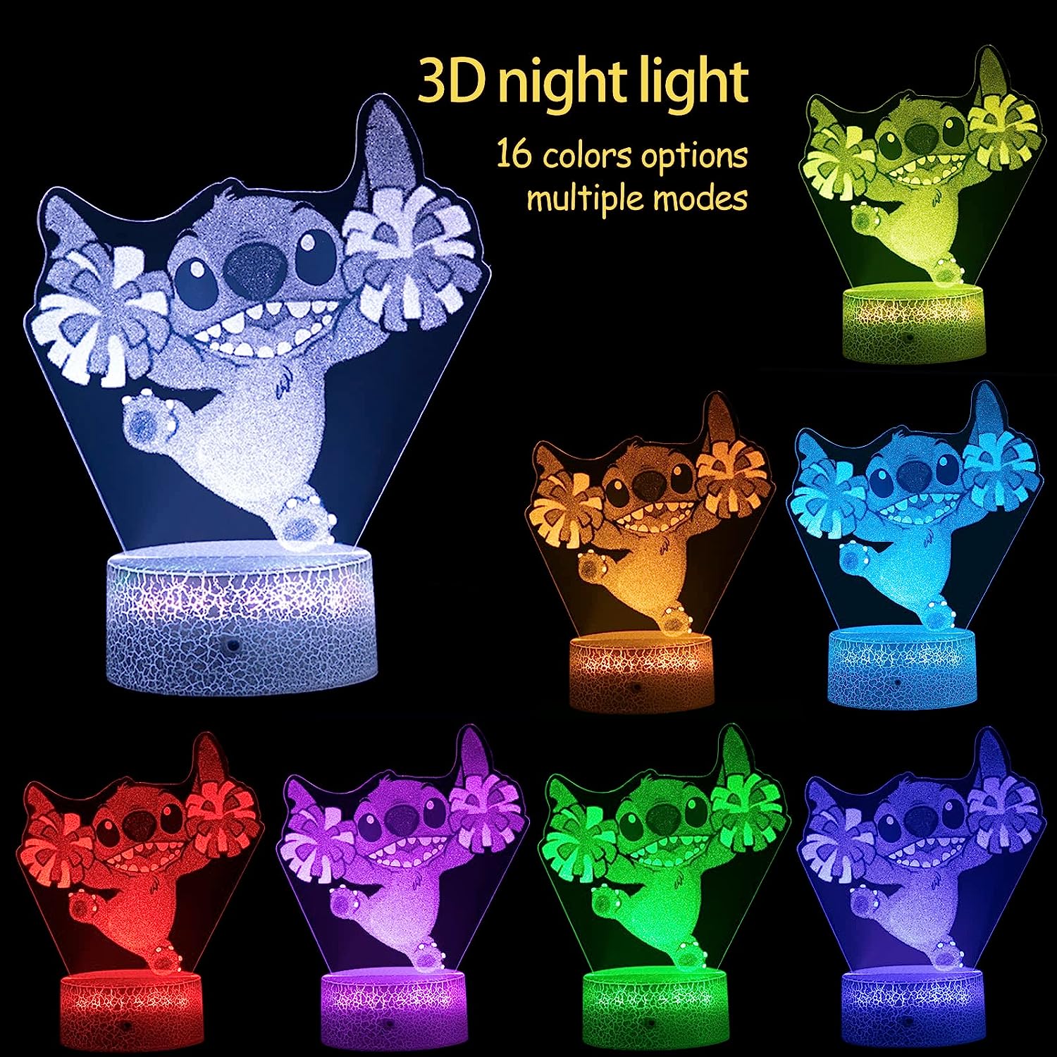 - Luces nocturnas de puntada: con controles remotos y táctiles, la luz nocturna 3D Stitch ofrece 7 opciones de cambio de color y 16 colores diferentes. Puedes elegir configurarlo como un color estático o degradado, o disfrutar de la luz de respiración o características parpadeantes.