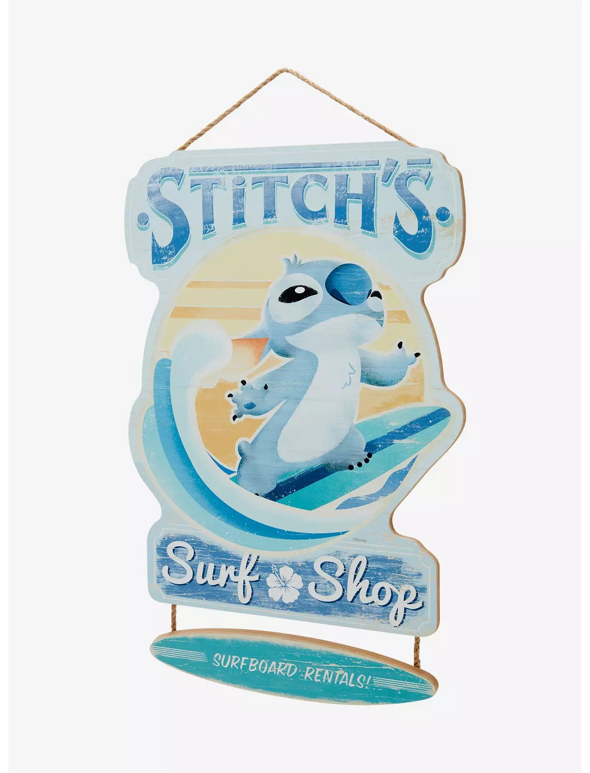 ¡Lleva la playa a tu decoración con este letrero inspirado en Lilo & Stitch! Con un diseño de Stitch surfeando entre las letras "Stitch's Surf Shop", este letrero incluye una tabla de surf adjunta impresa con "Surfboard Rentals". Con una cuerda para colgar, este letrero es perfecto para agregarlo a cualquier espacio.