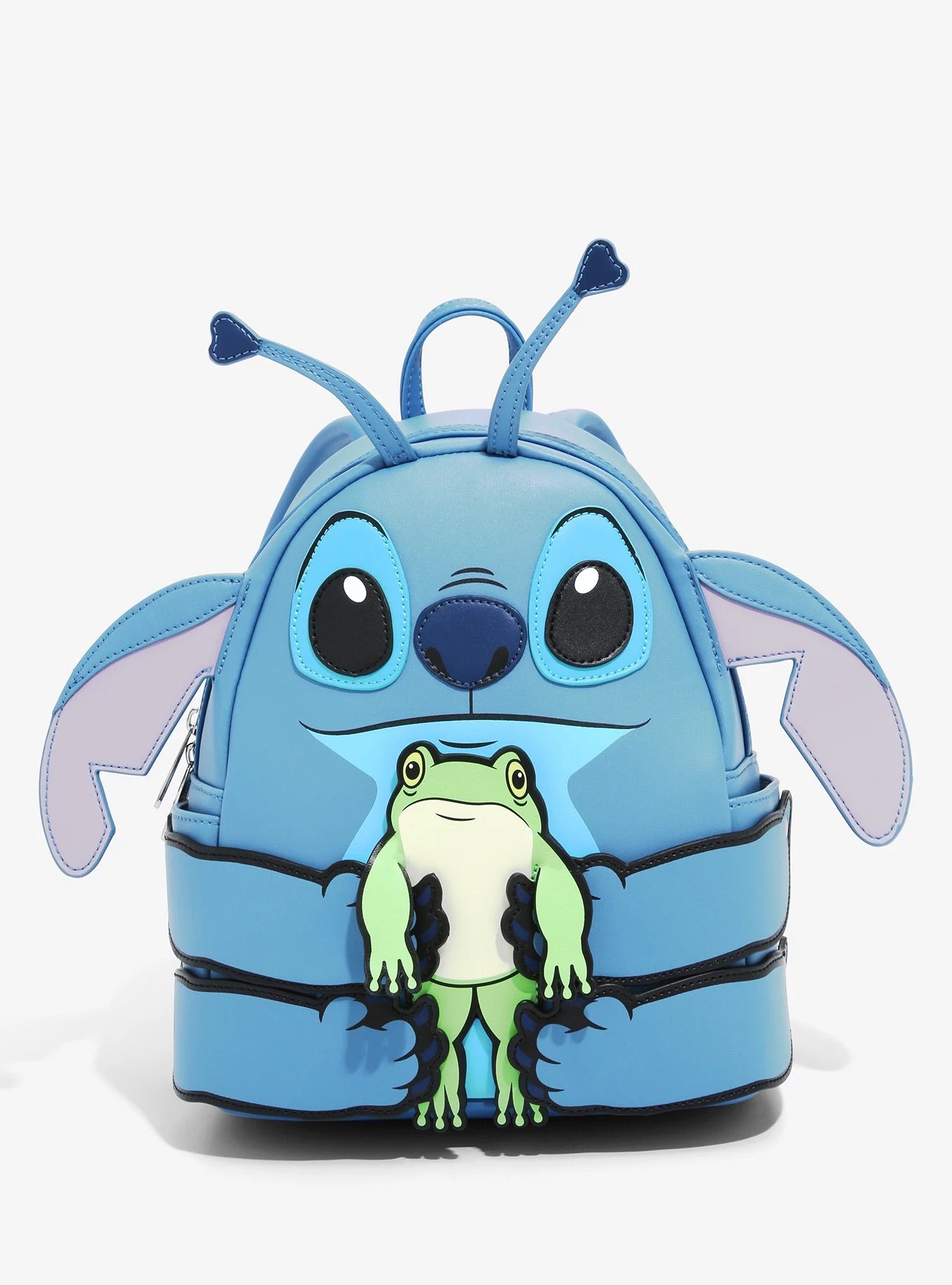 Invita a Stitch si quieres una experiencia inigualable. El alienígena espacial de Lilo & Stitch de Disney sostiene una rana en la parte delantera de esta mini mochila de piel sintética, y sus cuatro patas se pueden quitar de los botones a presión y girar.