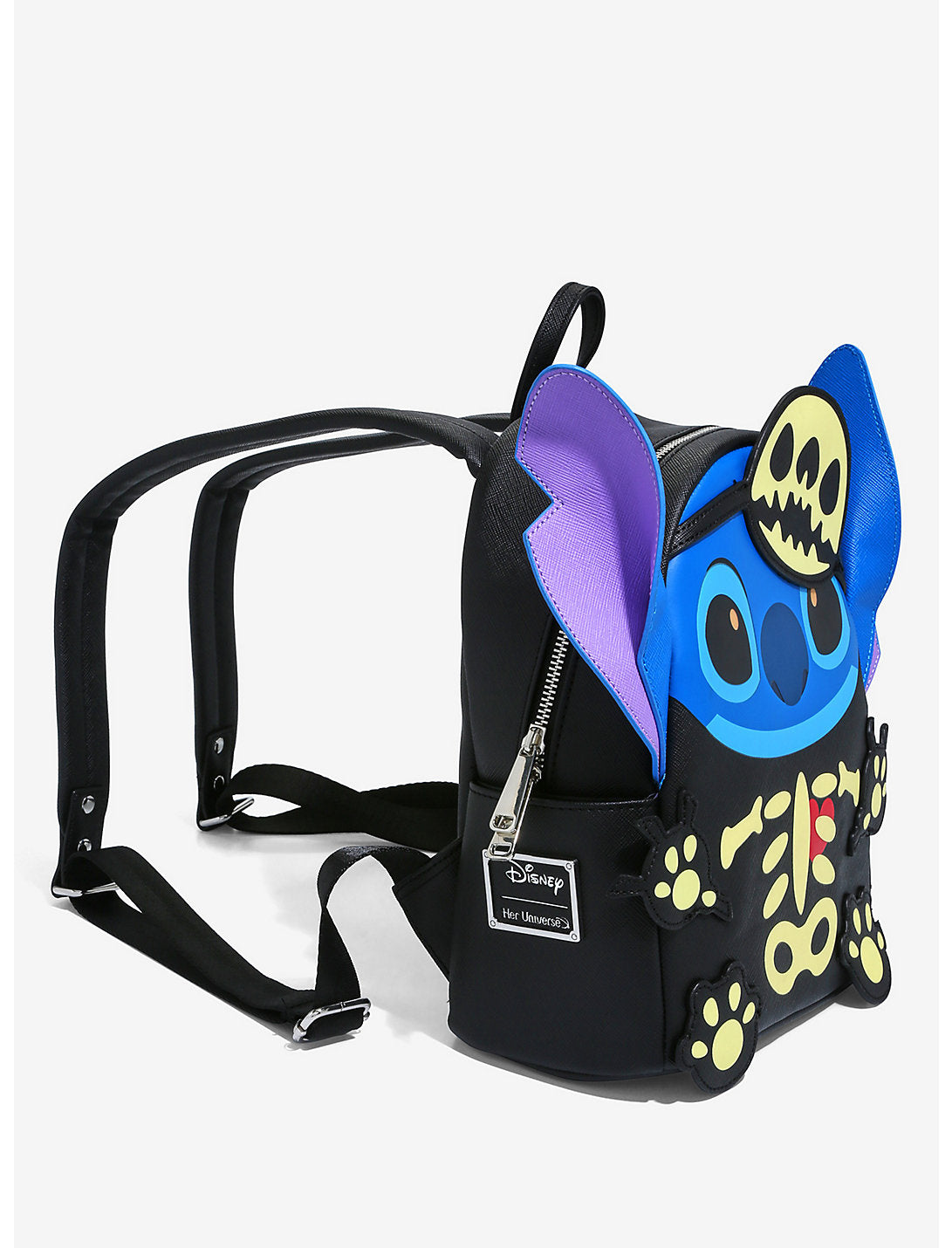 ¡Stitch trae a los fantasmas como esta mini mochila de Lilo & Stitch que brilla en la oscuridad de Her Universe! Con detalles de figuras como orejas en 3D, este bolso es el look perfecto para pedir dulces y otras actividades festivas. También cuenta con herrajes en tonos plateados, correas de hombro ajustables, insignia de la marca esmaltada y forro interior de Stitch esquelético para el toque perfecto de la magia de Disney.