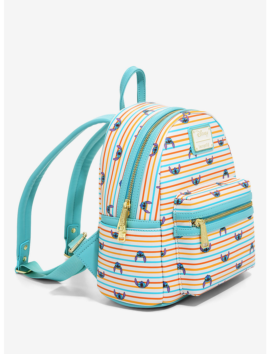 ¡Empaca todas tus necesidades diarias para tu escapada tropical en esta mini mochila Loungefly inspirada en Lilo & Stitch! Con un patrón de rayas retro con un estampado integral de Stitch y sus diversas expresiones, este bolso incluye herrajes en tonos dorados, una insignia de la marca esmaltada y un patrón de cara interior de Stitch. ¡Use este bolso y sea el gran kahuna elegante en la playa!