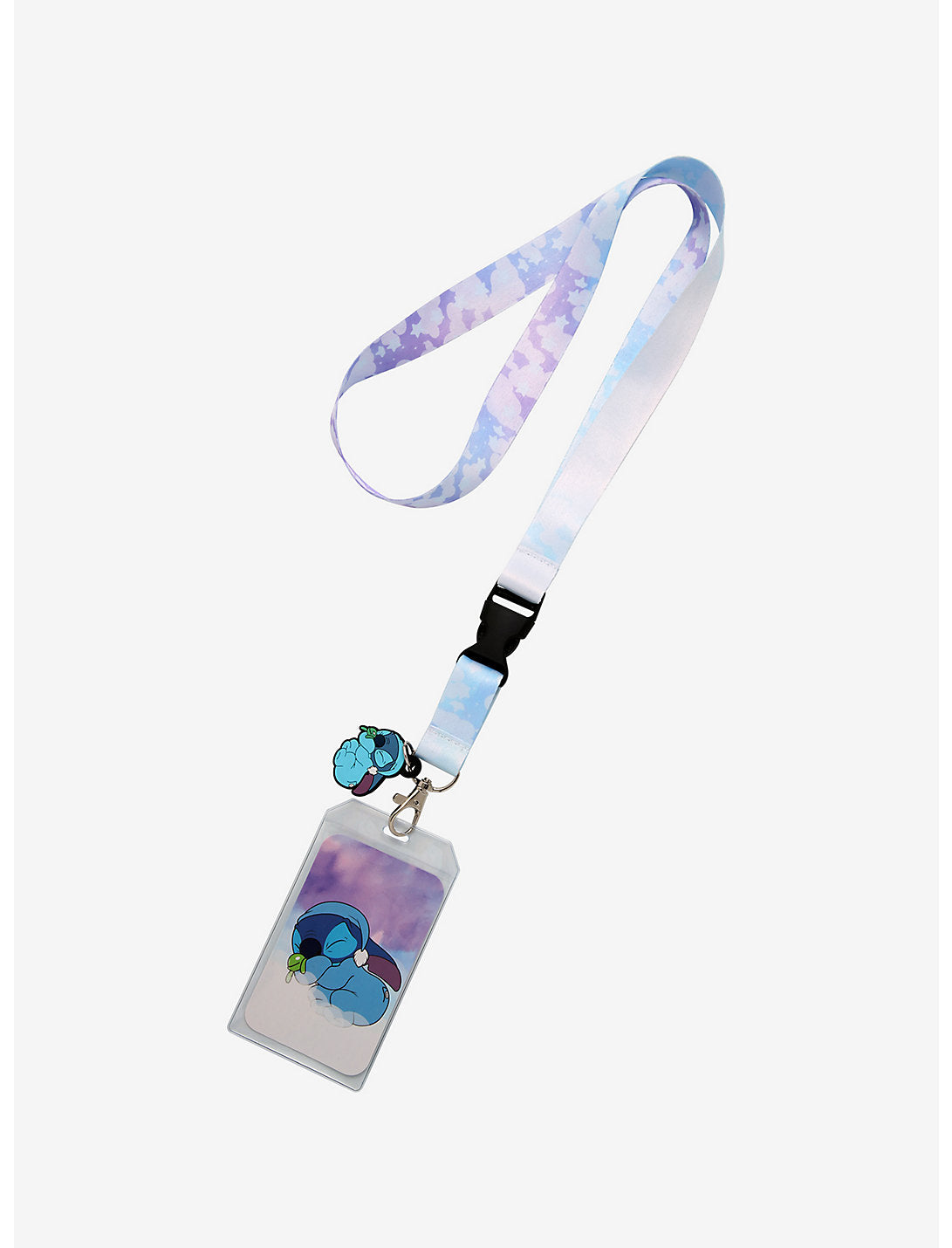 ¡No tenga demasiado sueño y pierda sus llaves! Sujételos a este cordón con un estampado de nubes ombré azul y morado. Pantalla de identificación transparente desmontable y amuleto de goma de una puntada para dormir.