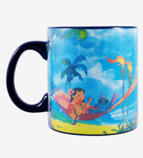 Aloha! Antes de ir a un día de playa con tu ohana, no olvides tu taza de café diaria. Esta taza negra presenta Stitch, ¡pero espera! Cuando viertes un líquido caliente, una escena de playa parece mágica.