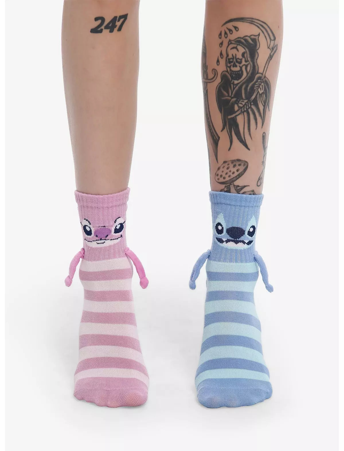 ¡Mantén tus pies cómodos con un poco de amor! Estos calcetines que no combinan con diseños de rayas azules y rosas inspirados en Stitch y Angel. Viene con un brazo 3D con detalles en la parte superior con imanes que permiten a la pareja tomarse de la mano. ¡Demasiado lindo!