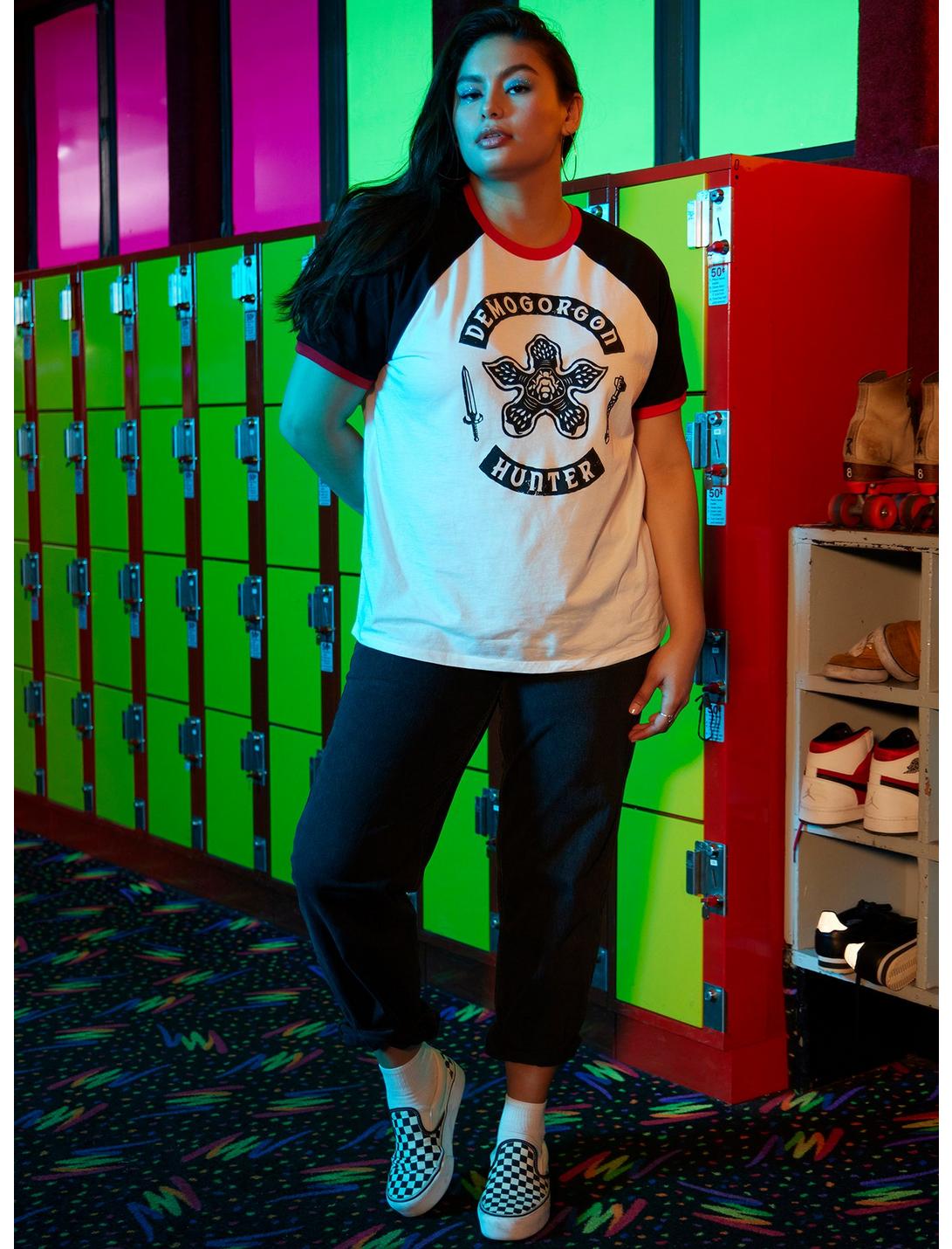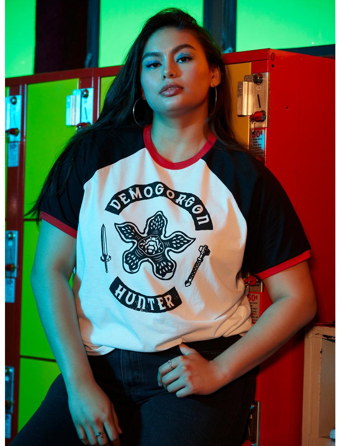 ¿Listo para derrotar a más Demogorgons con la pandilla? ¡Entra al Upside Down con estilo con esta camiseta raglán! De la última temporada de Stranger Things, este top raglán presenta "Demogorgon Hunter" en el frente, con un Demogorgon en el centro y rodeado de armas. Viene con ribete rojo en contraste.