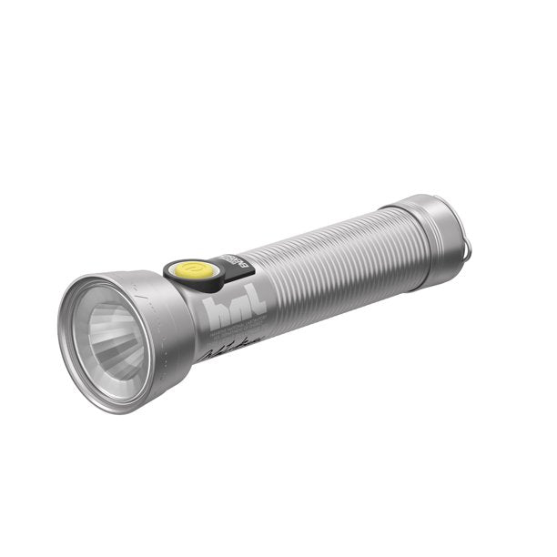 Con un aspecto vintage, esta linterna retro LED cuenta con detalles grabados con láser, un interruptor de botón amarillo, un colgador de anillo integrado y un cuerpo acanalado resistente al agua.