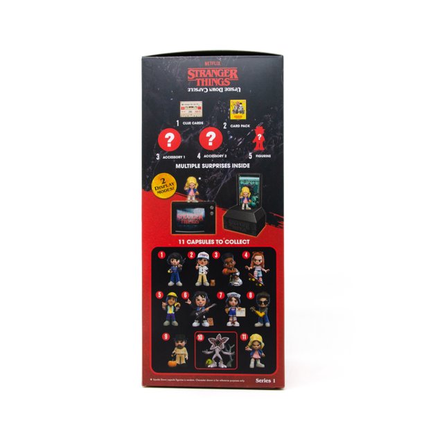 COLECCIONA LAS 11 CÁPSULAS DE STRANGER THINGS: Desempaca una gran cantidad de nostalgia de los 80 con cada cápsula que contiene (3) tarjetas de intercambio de escena, (1) tarjeta de personaje, (1) tarjeta de arte, (1) tarjeta de visualización de TV, (1) tarjeta de revelación de calcomanías, ¡todas con obras de arte nunca antes vistas además de una figura de personaje y accesorios!