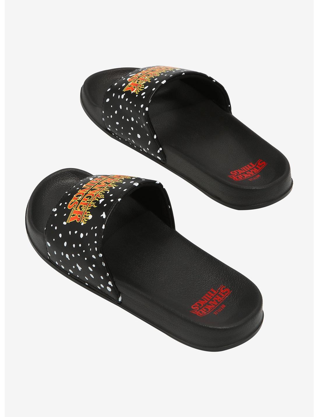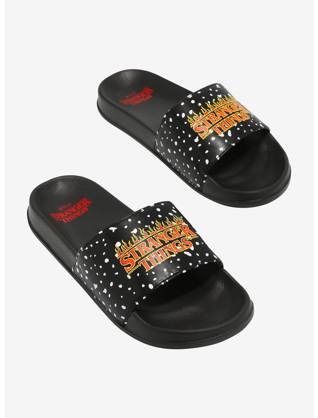 ¿Pasar la tarde jugando a Dungeons & Dragons con el Hellfire Club? ¡Manténgalo informal con estas sandalias deslizantes! Este par presenta un patrón moteado blanco con el logotipo de Stranger Things en llamas.
