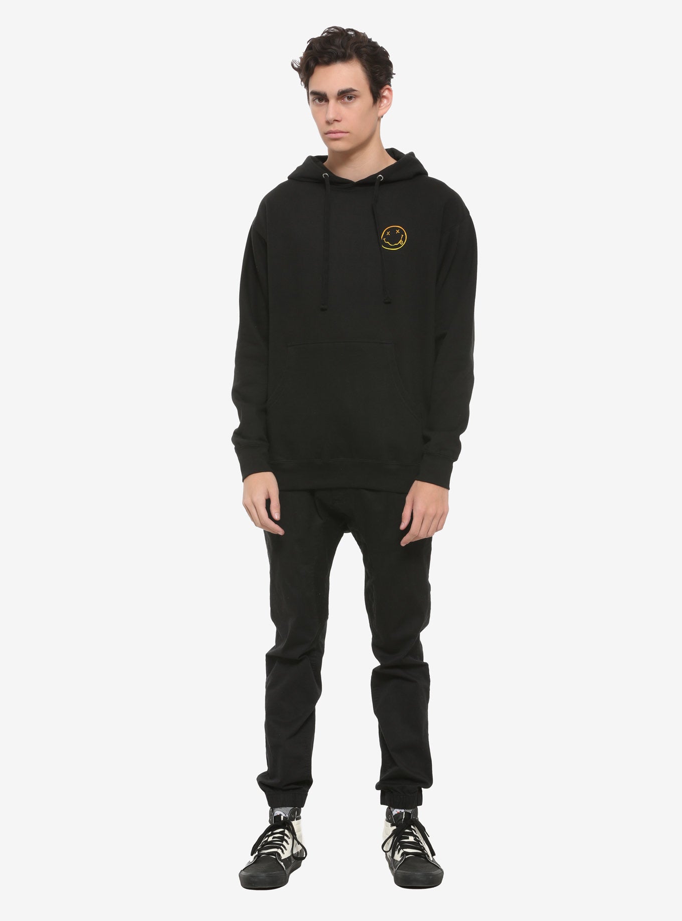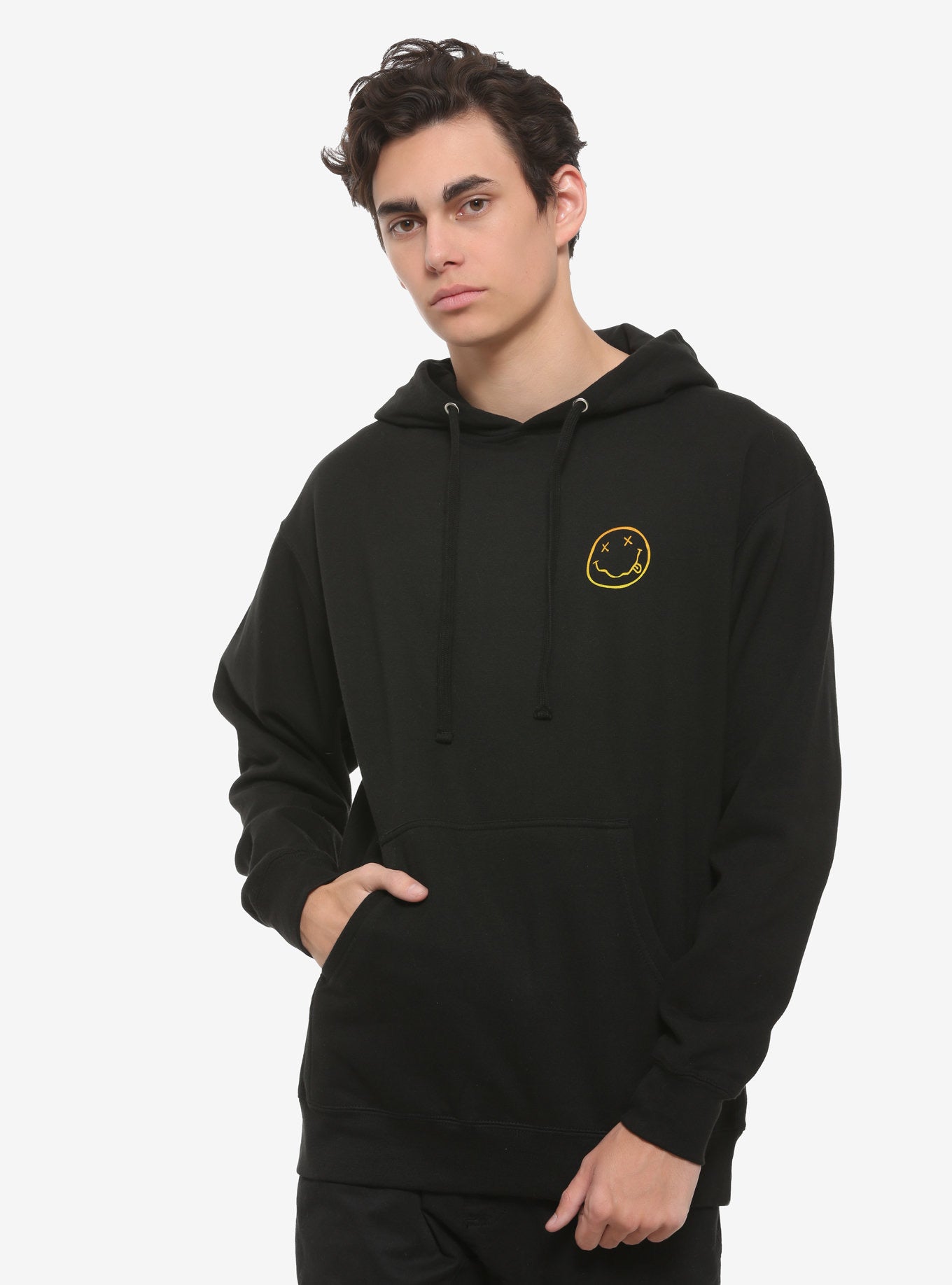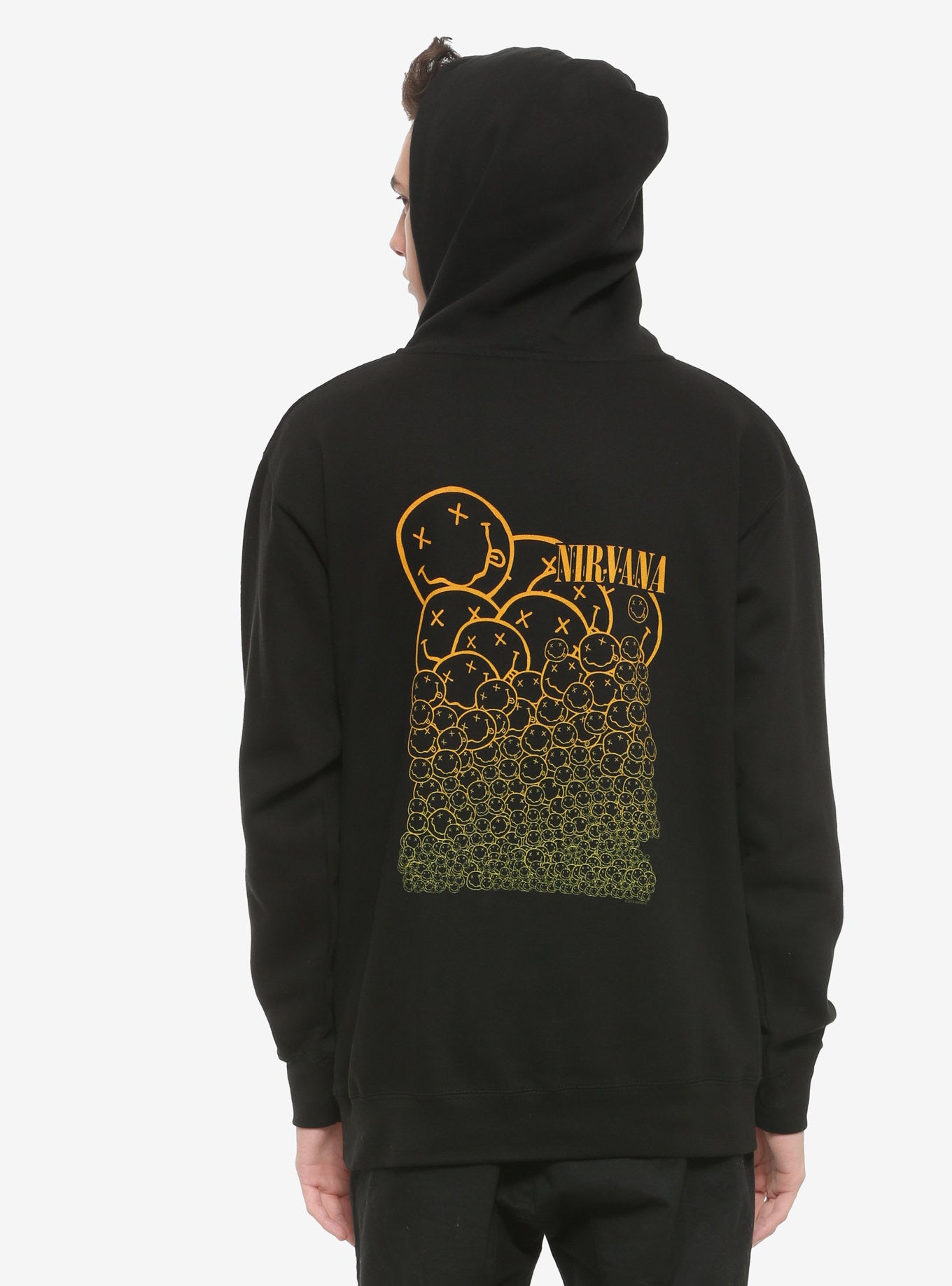 - Esta sudadera con capucha negra de Nirvana está impresa con un logotipo de smiley ombre amarillo y naranja en el pecho y un diseño de smileys repetidos en la parte posterior. Con capucha con cordón y bolsillo canguro frontal.