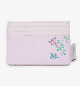 No pierdas tus tarjetas mientras caminas sobre un sueño. Este tarjetero de piel sintética presenta un vestido rosa Aurora con flores y pájaros. Seis ranuras para tarjetas.