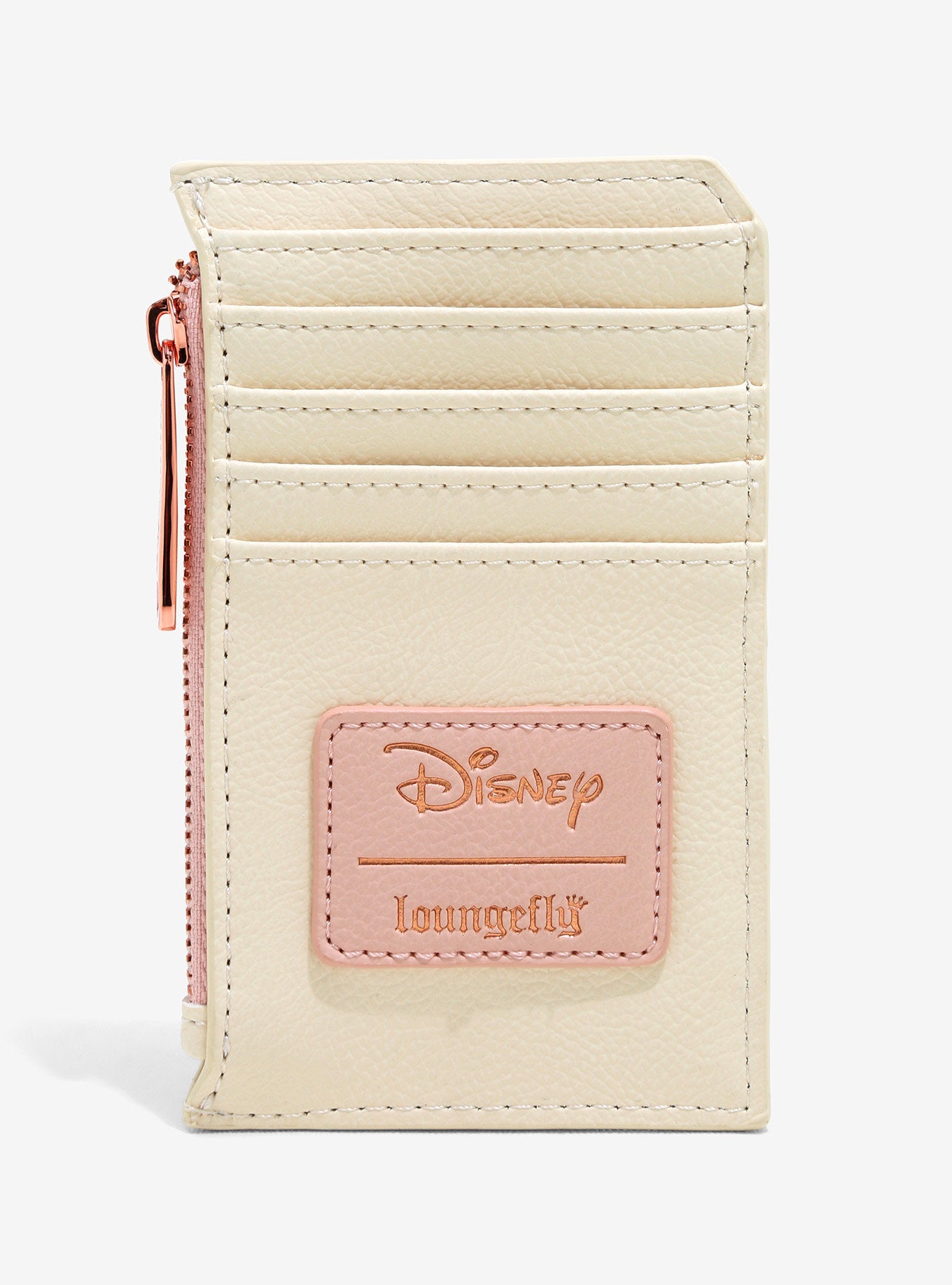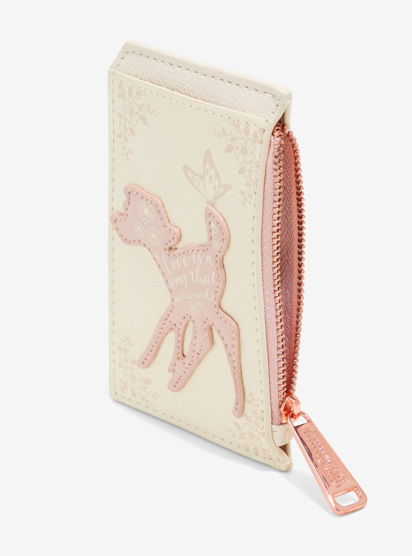 Este tarjetero de Disney cuenta con un diseño de silueta de Bambi en oro rosa y rosa, ranuras para tarjetas y bolsillo con cremallera. Poliuretano de 3 "x 5"