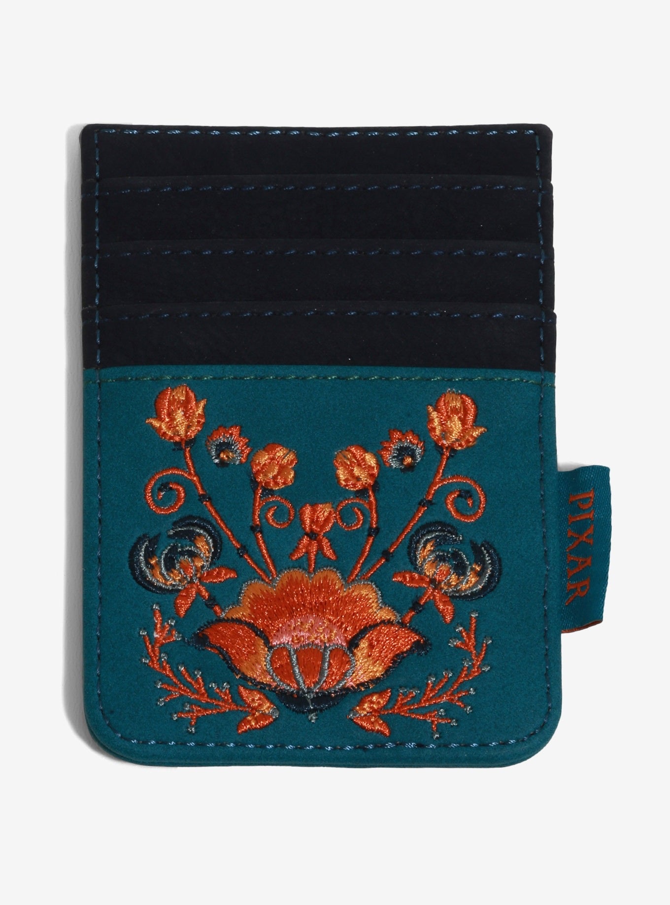 ¡Lleva el espíritu de aventura junto con tus tarjetas! Este tarjetero de piel sintética incluye varias ranuras para tarjetas, detalles bordados fascinantes y obras de arte con Mérida con adorables cachorros de oso Harris, Hubert y Hamish de Disney • Pixar's Brave.