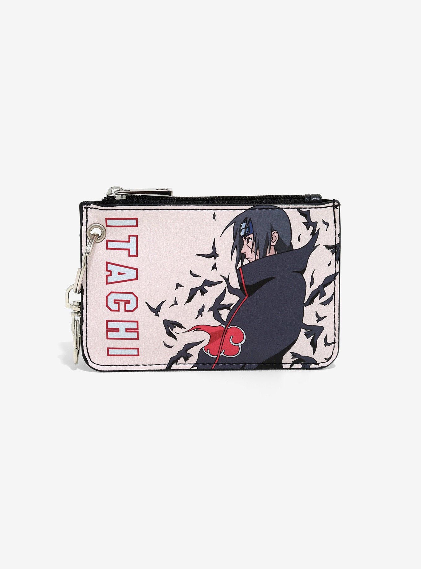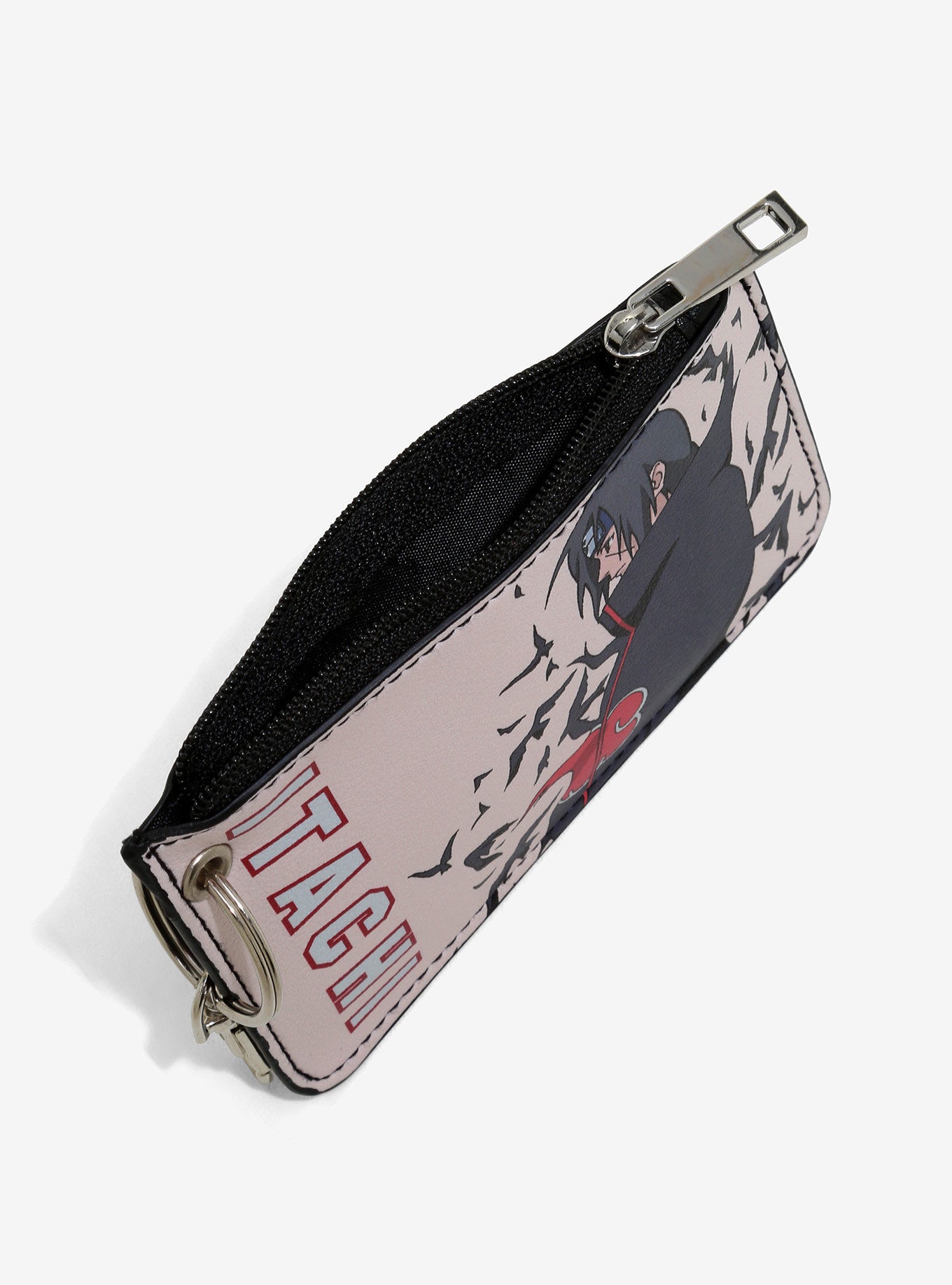 Impreso con Itachi y su nombre en un lado y con una ventana de identificación transparente en el otro. Cierre de cremallera superior y llavero plateado.