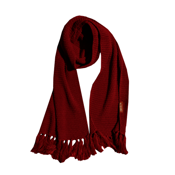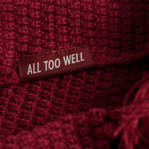 - Bufanda de punto roja con etiqueta tejida "All Too Well".