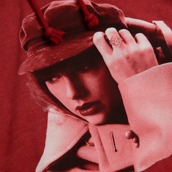 Sudadera con capucha roja con foto de portada de álbum en tono rojo impresa en el frente y "Taylor Swift Red (Taylor's Version)" impreso en la parte posterior.