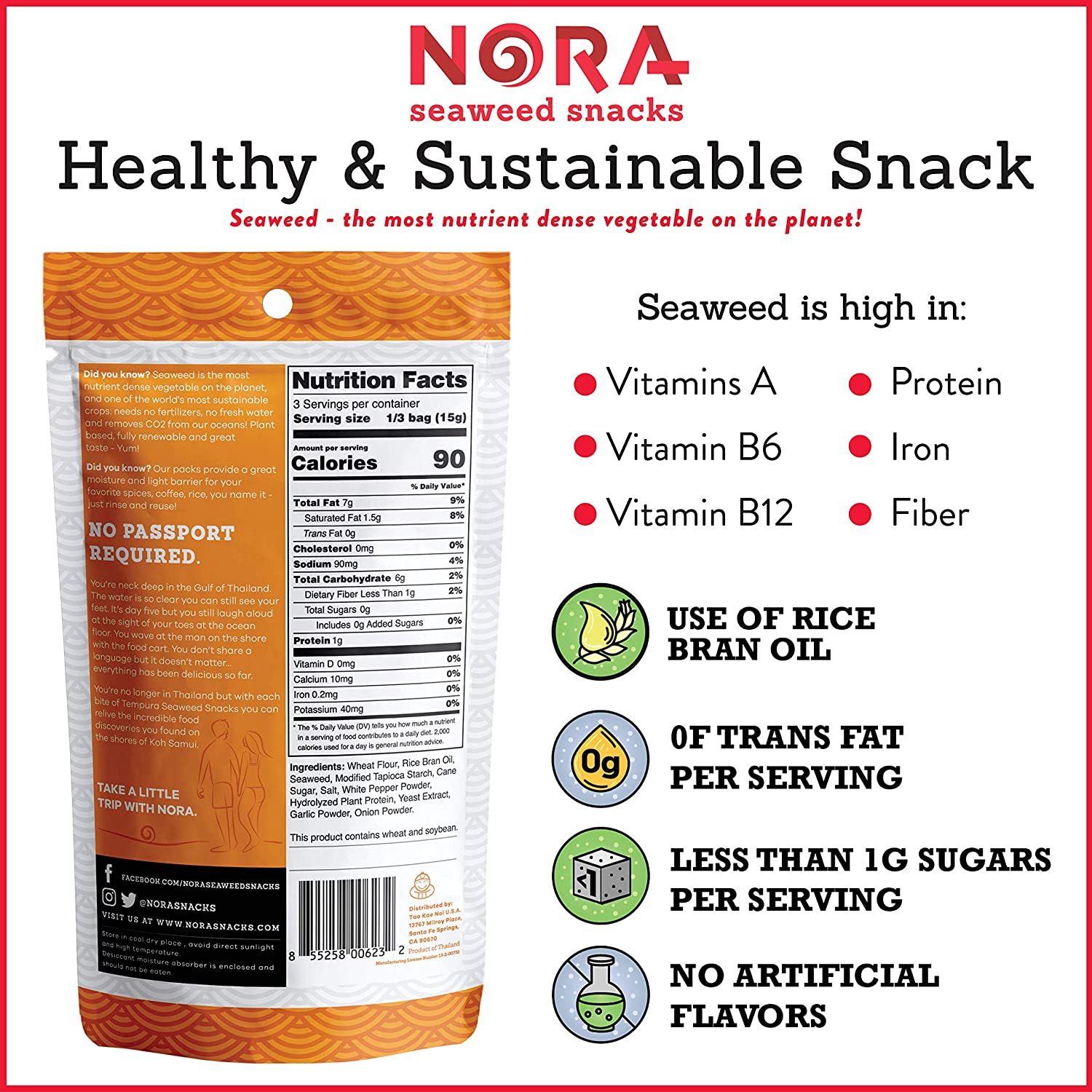 SNACK DE ALGAS MARINAS Con sabor tailandés y deliciosas, las algas marinas Nora Tempura te permitirán revivir los increíbles descubrimientos de alimentos que encontraste en las costas de Tailandia. Crujiente y crujiente como una papa frita, pero vegana y baja en azúcar, Tempura Original Crispy Seaweed es lo último en refrigerios saludables. Paquete de 6.