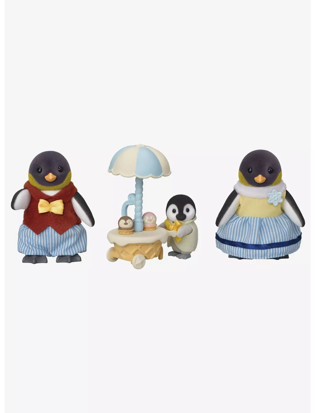 ¡Amplía tu colección Calico Critters con este conjunto de figuras de Penguin Family! Con los padres pingüinos y el bebé, este conjunto incluye ropa removible y un carrito de helados, perfecto para agregar a tu ciudad.