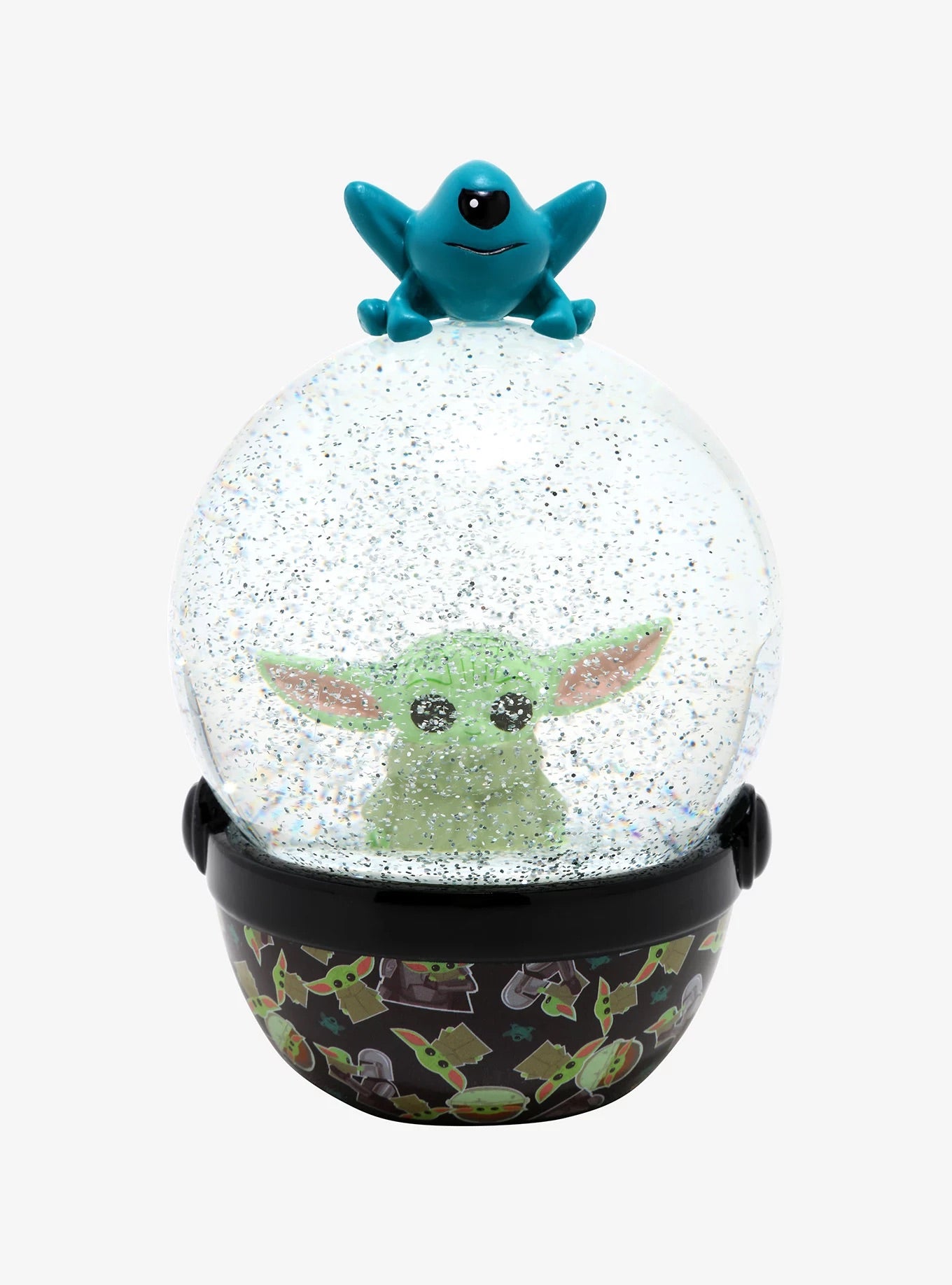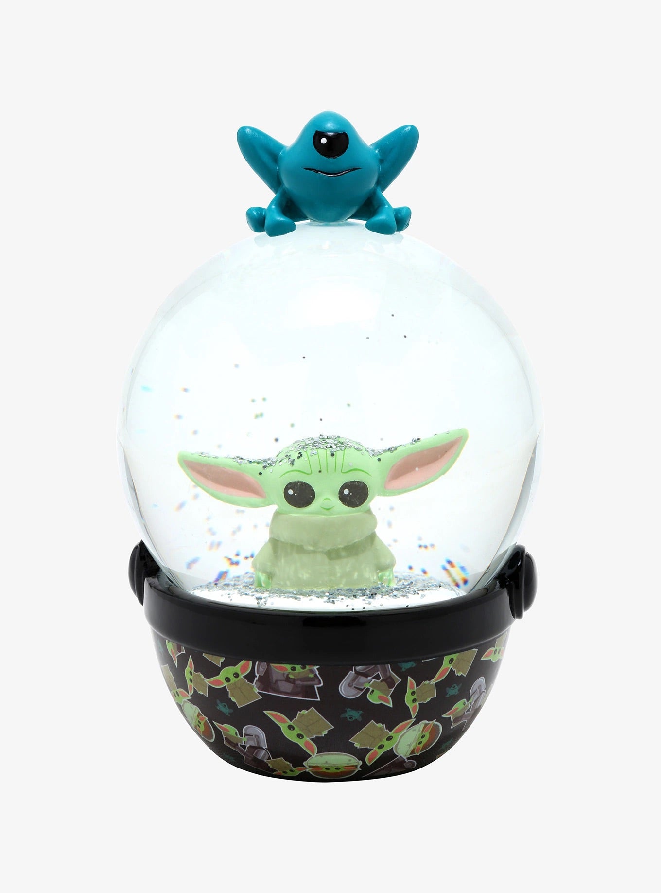 ¡Encontramos la bola de nieve más linda de la galaxia! De The Mandalorian, presenta al Niño con brillo plateado. Una rana Sorgan verde azulado se sienta en la parte superior y la base presenta una impresión de lanzamiento del Niño y Mando. 5 3/4 "de alto Vidrio; resina