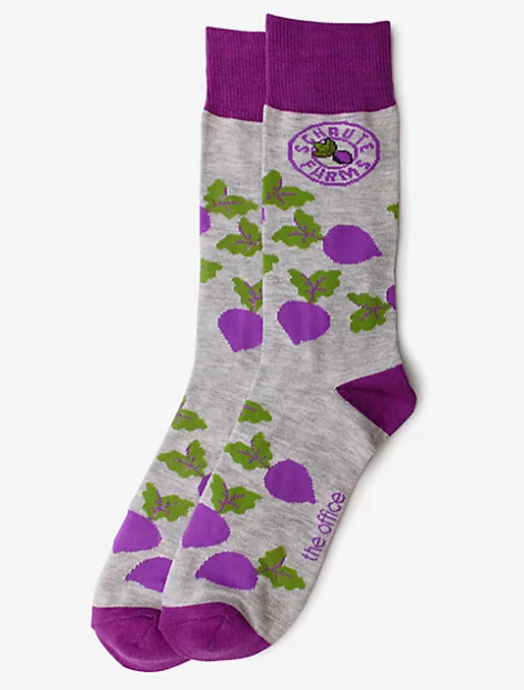 ¿Tienes un recuerdo de tu visita a Schrute Farms? Estos calcetines deportivos de The Office cuentan con un estampado de remolachas moradas con un logotipo de Schrute Farms en la parte superior.