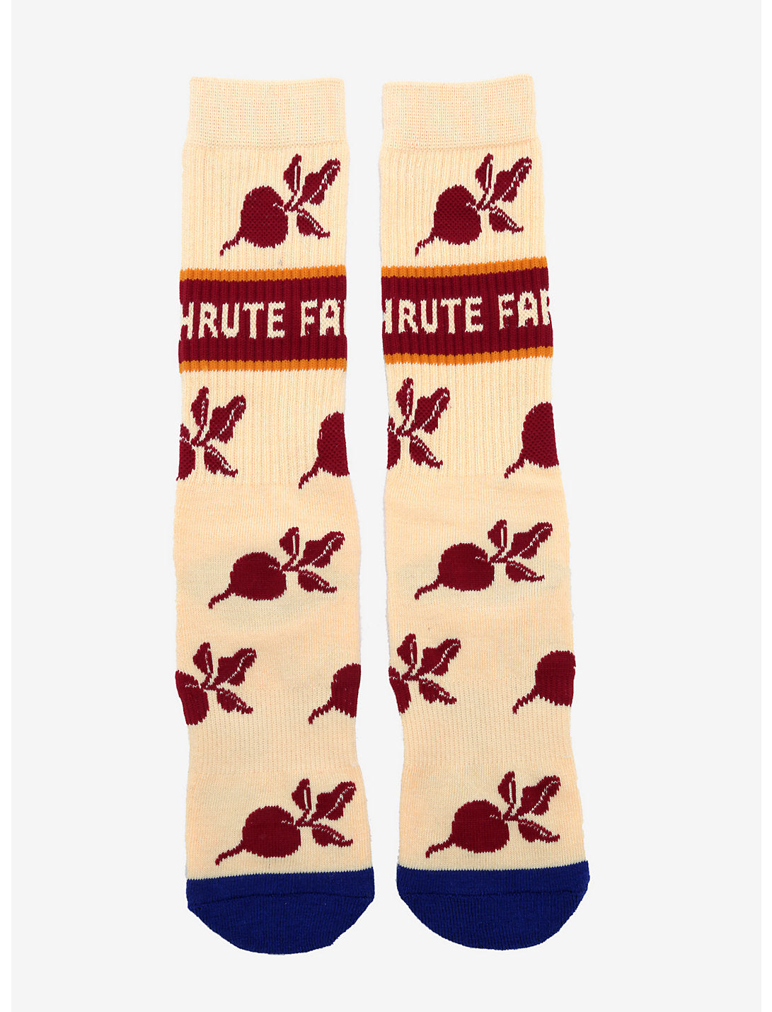¿Quién es mejor Asistente (del) Gerente Regional que Dwight? Remolacha nosotros. ¡Sigue sus pasos con estos calcetines color crema, granate y azul marino con un diseño de Schrute Farms inspirado en The Office!