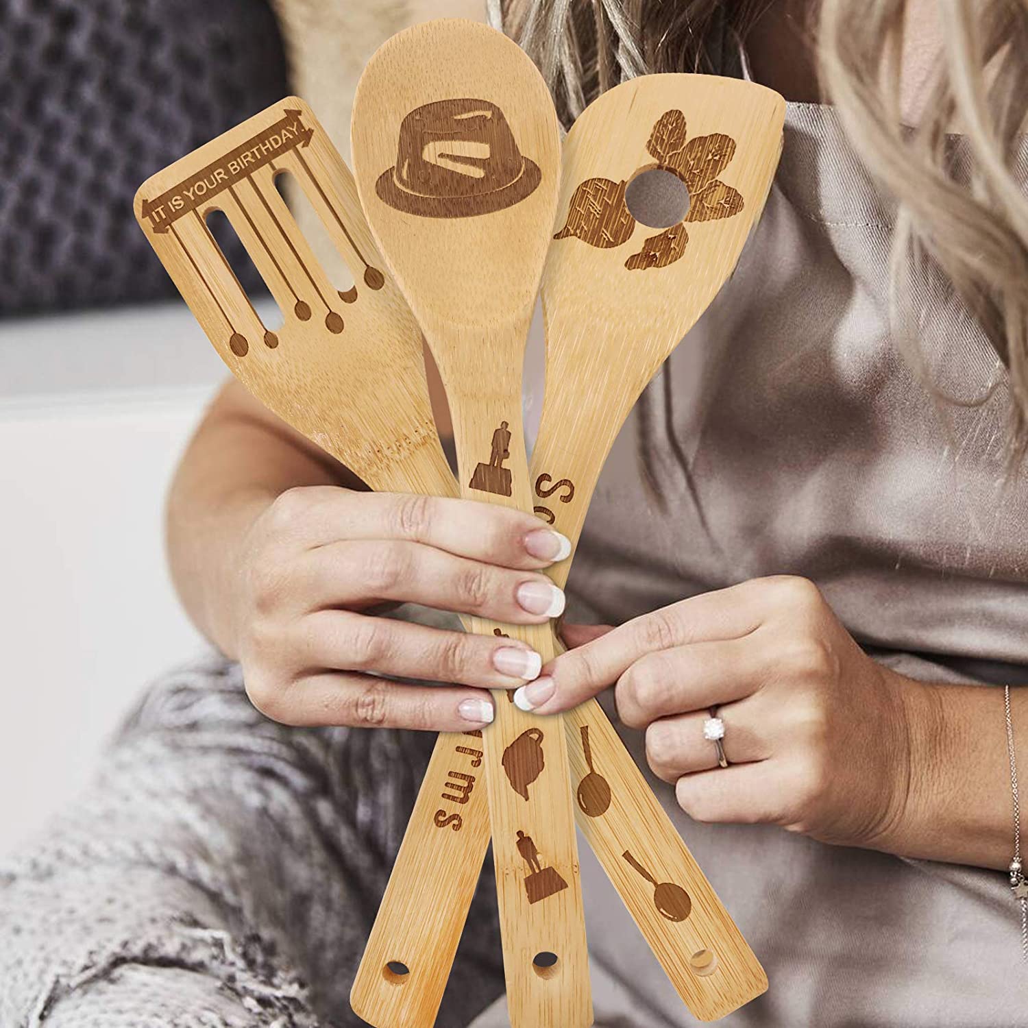 - Tamaño adecuado y calidad premium: las cucharas de madera miden aproximadamente 11.8 x 2.4 x 0.3 in. Las cucharas están hechas de bambú grueso y de alta calidad, sin materiales químicos. Los patrones grabados en las cucharas están bien diseñados y pueden parecer un poco diferentes debido a la característica del bambú.