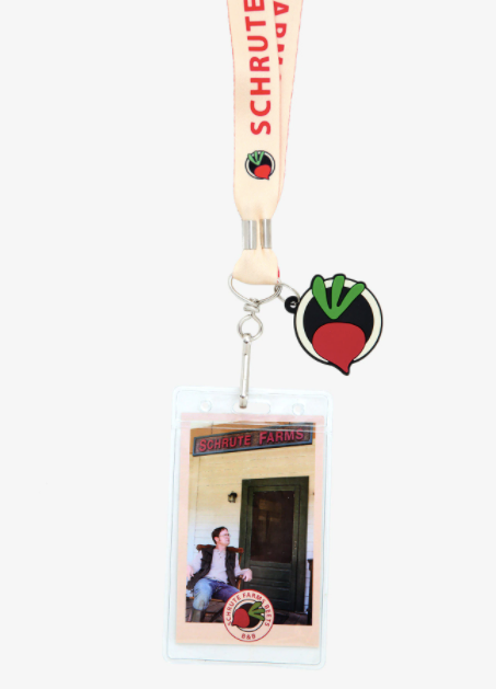 Conmemore su estadía en Schrute Farms con este cordón que dice "A la gente le encantan las remolachas" (verdadero) y "Schrute Farms Beets" (también un hecho real, así como el nombre de la granja). Con un bolsillo transparente de identificación y un logotipo de remolacha de goma.