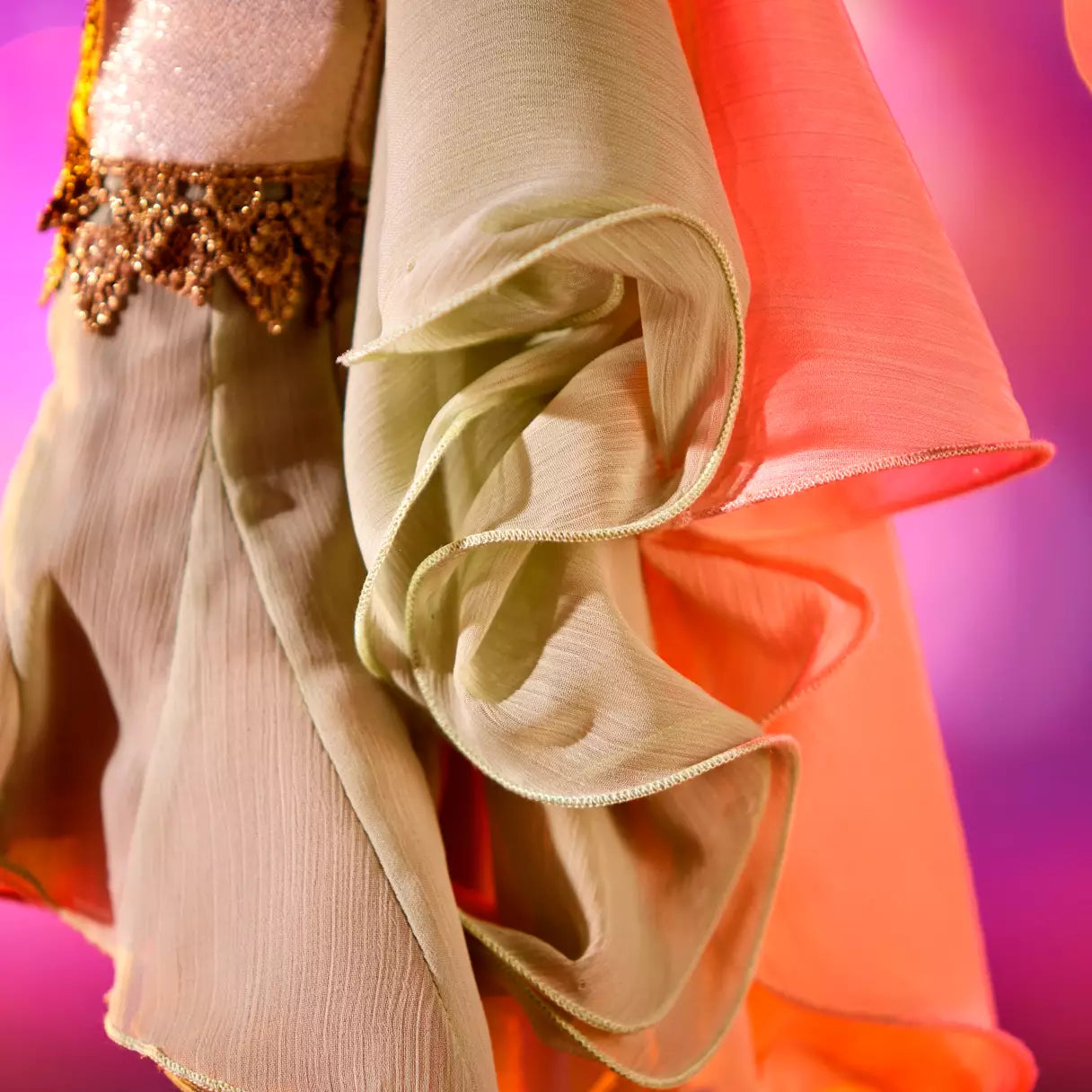 Para el vestido de fiesta de la mansión de Tiana, Ida se inspiró en la era de glamour resplandeciente de la década de 1920. El estilo combina con la elegancia de Tiana, personificando la belleza de la princesa del pantano. Ida está orgullosa de generar impacto al diseñar esta pieza de edición limitada.